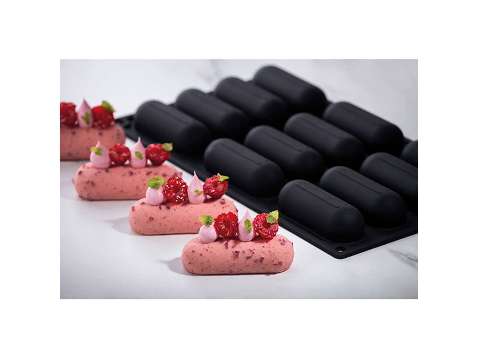 El molde de silicona Pavoflex Confy mide 300 x 175 mm y pesa 320 gramos, lo que lo hace fácil de manejar y almacenar. Cada una de las 12 cavidades mide 80 x 30 x 24 mm con un volumen de 40 ml, perfecto para porciones de postres. El color negro no solo proporciona un aspecto profesional, sino que también ayuda a distribuir el calor de manera uniforme durante la cocción.