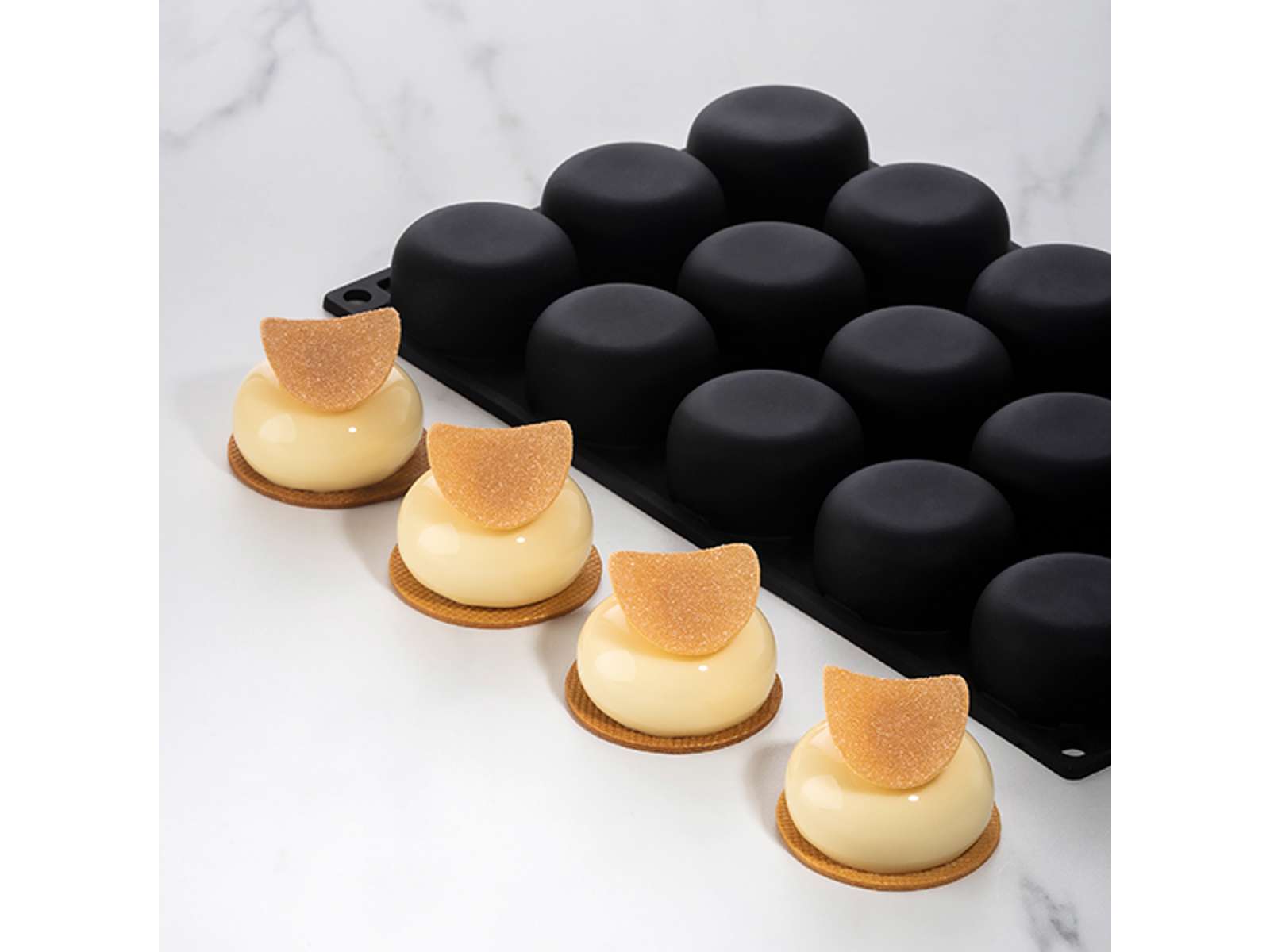 En la placa compacta de 300x175 mm, obtienes 15 cavidades, lo que permite producir múltiples unidades al mismo tiempo. Esto ahorra tiempo y asegura uniformidad en toda la producción. Con un volumen de 40 ml por cavidad, el tamaño es perfecto para postres en porciones, petit fours o pequeños pasteles que no solo tienen un aspecto profesional, sino que también son del tamaño adecuado para servir.