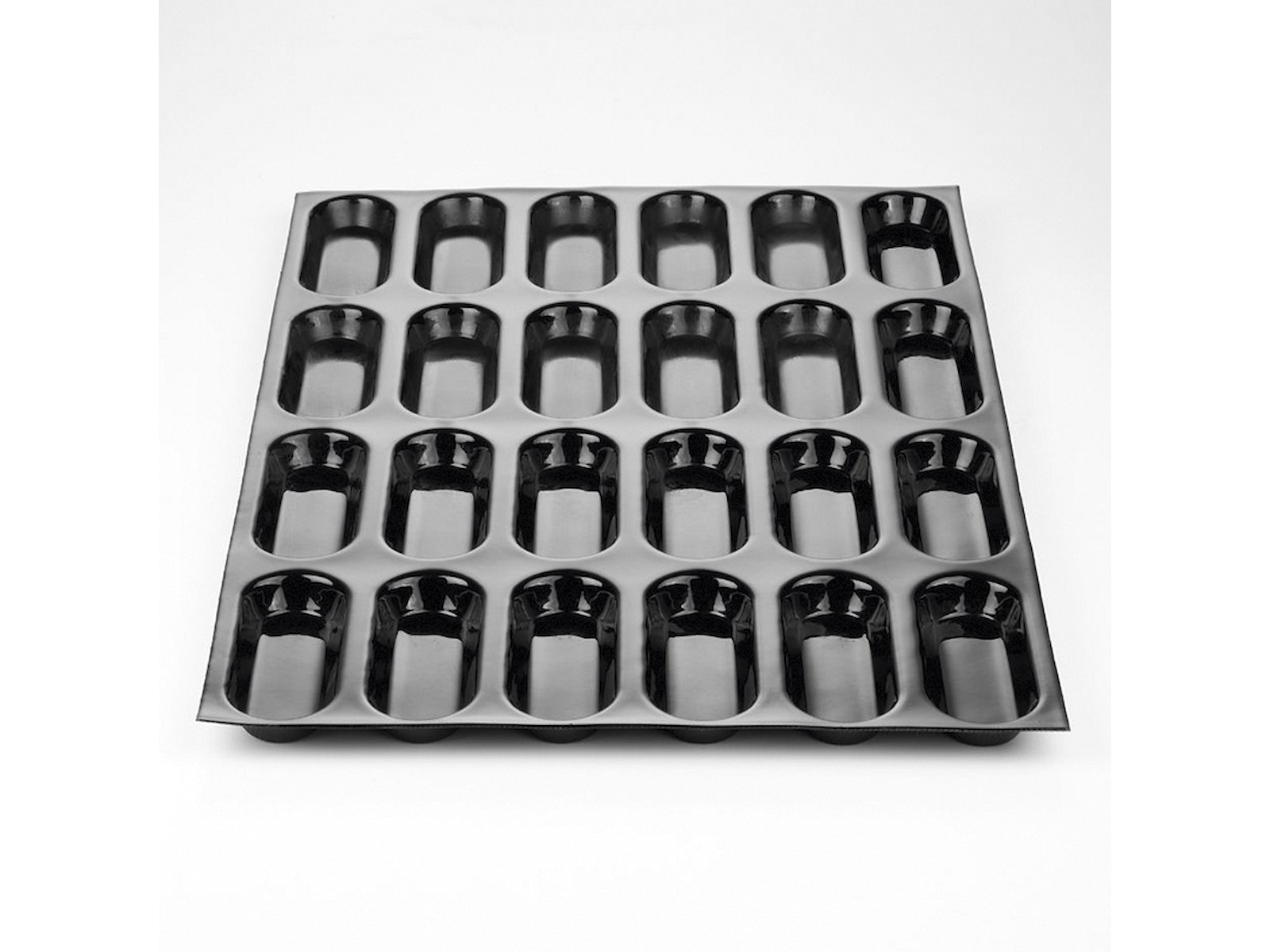 El molde mide 600x400 mm y tiene 24 cavidades diseñadas específicamente para éclairs. Pesa 518 gramos, lo que lo hace lo suficientemente sólido para un uso profesional sin ser innecesariamente pesado. El molde es compatible con bandejas de hornear estándar y rejillas de horno en cocinas profesionales.