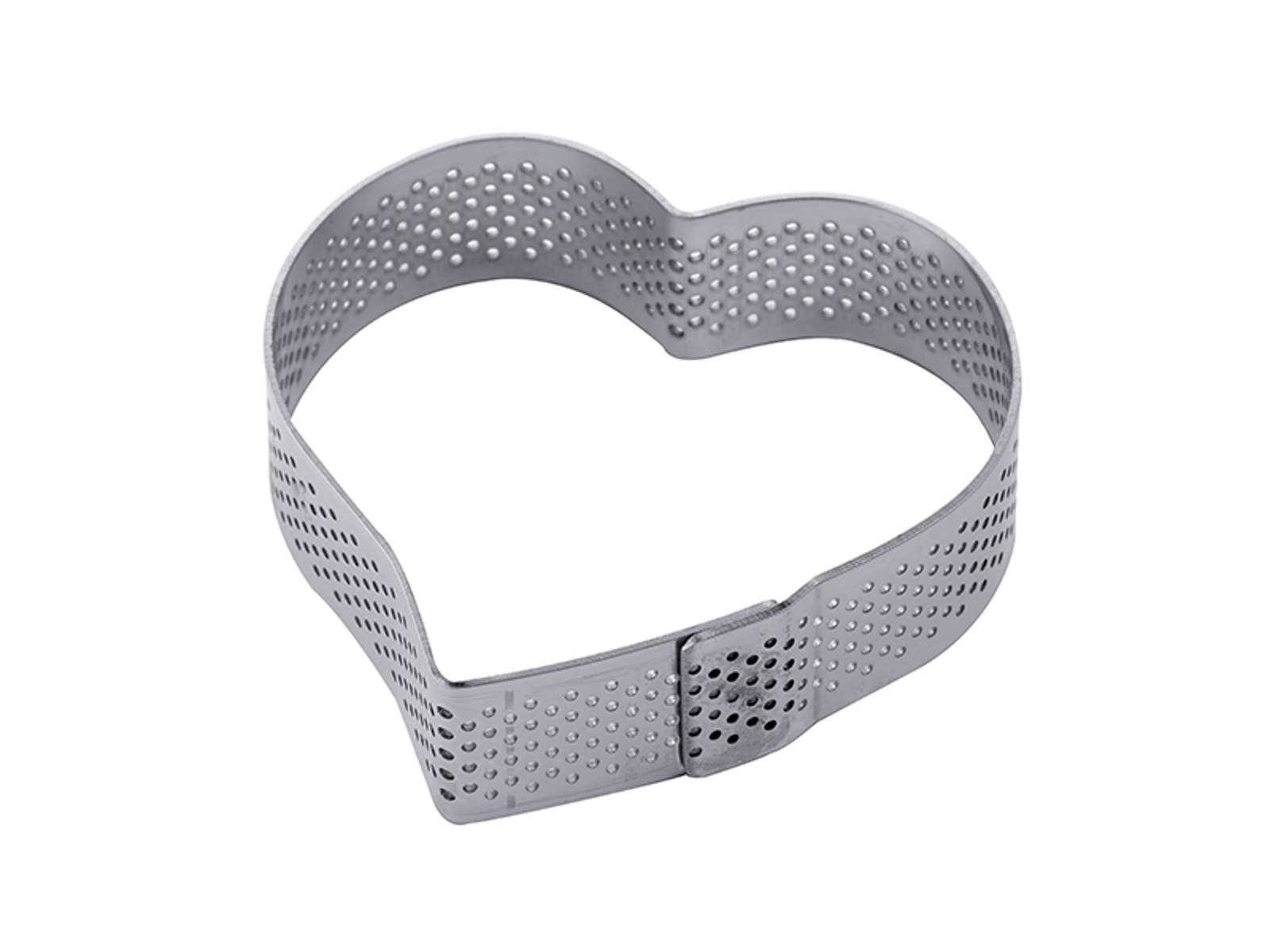 El anillo de repostería mide 74x62x20 mm, lo que lo hace perfecto para postres servidos en porciones. Está fabricado de acero inoxidable apto para contacto con alimentos, que es tanto higiénico como duradero. La especial forma de corazón aporta un estilo elegante a tus creaciones, mientras que la construcción perforada garantiza una distribución uniforme del calor, logrando así un resultado profesional en la repostería.