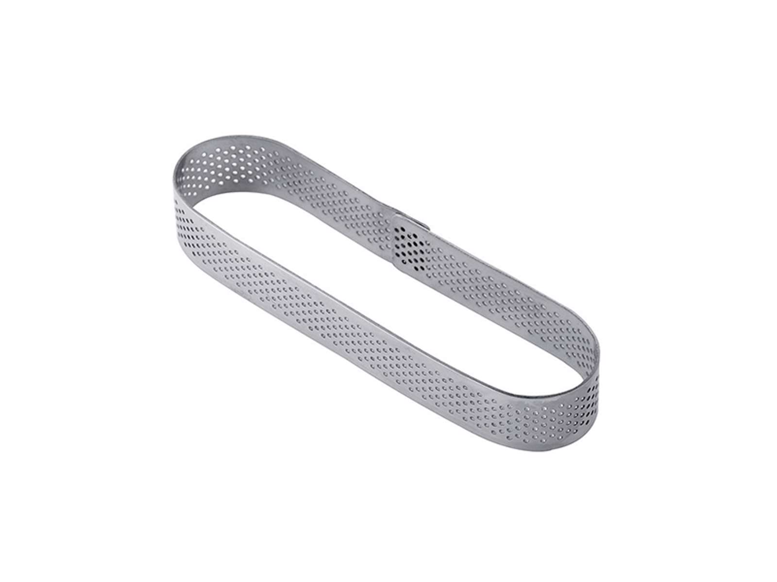 El molde mide 125 mm de largo, 30 mm de ancho y tiene una altura de 20 mm, lo que lo hace perfecto para porciones individuales. Pesa 400 gramos y está hecho de acero inoxidable con un diseño ovalado y microperforado. Este tamaño preciso permite obtener resultados uniformes cada vez, lo cual es crucial para la repostería profesional.