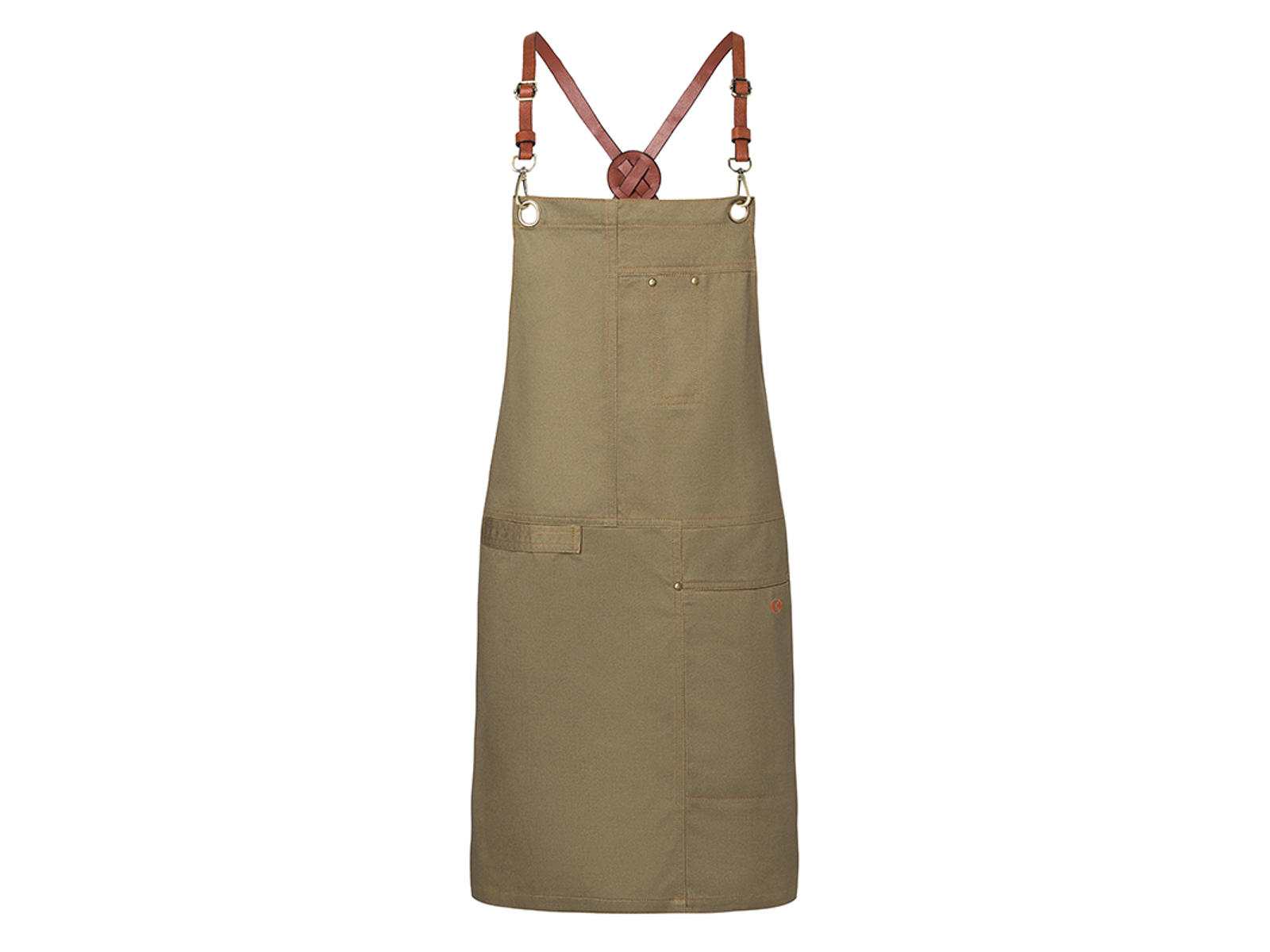 El delantal está fabricado en 100% algodón de un tono color arena que oculta manchas menores y brinda una expresión neutral y profesional. Con unas medidas de 68x80 cm, cubre eficazmente la ropa y protege contra salpicaduras y manchas. El peso total es de 413 gramos, lo que proporciona un buen equilibrio entre comodidad y protección. Los tirantes de cuero y los cierres de cabina en color cobre añaden tanto funcionalidad como interés visual.