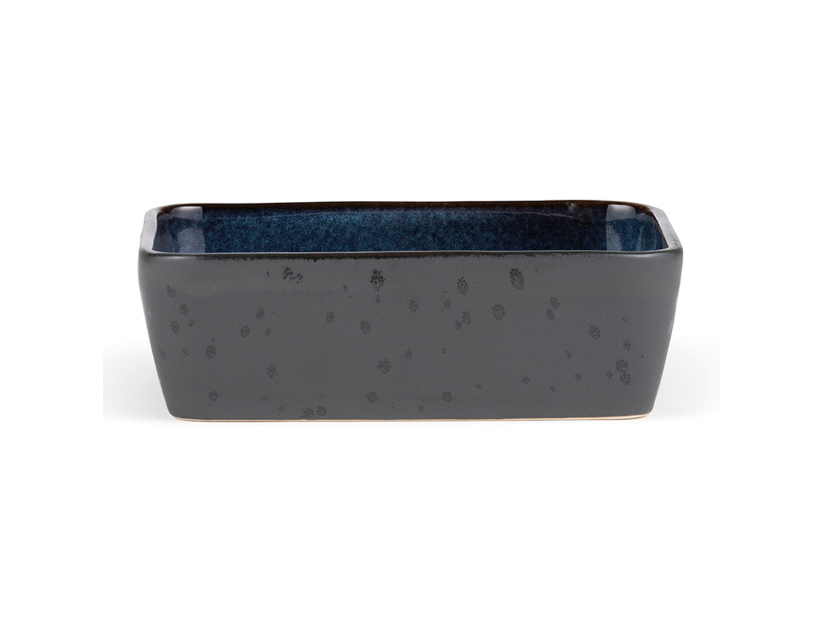 Este plato rectangular de Bitz combina un diseño elegante con una funcionalidad práctica. Con sus dimensiones de 19x14 cm y una altura de 6 cm, el plato ofrece una expresión estilizada a través del contraste entre la superficie mate negra de la cerámica en el exterior y el brillante esmalte azul oscuro en el interior. El esmalte reactivo crea matices y patrones únicos, convirtiendo cada plato en una pieza individual.