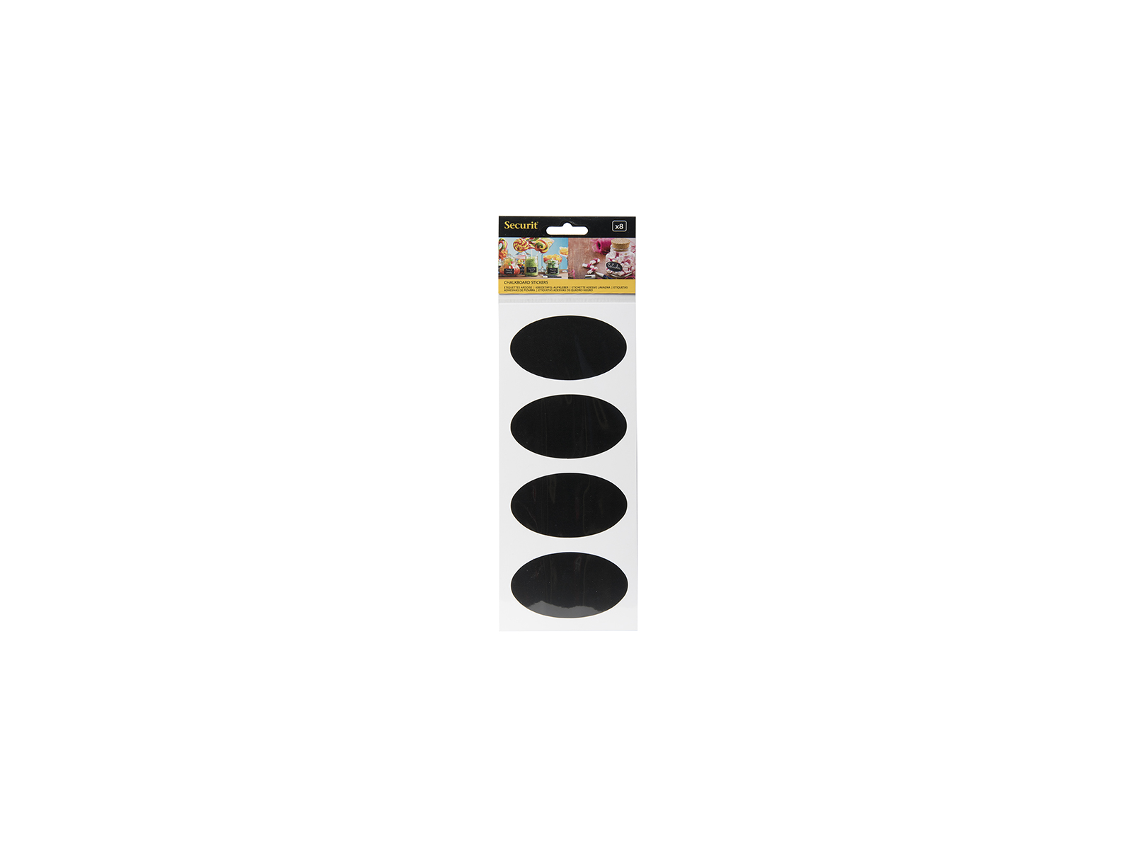 - Un práctico conjunto de 8 etiquetas ovaladas negras