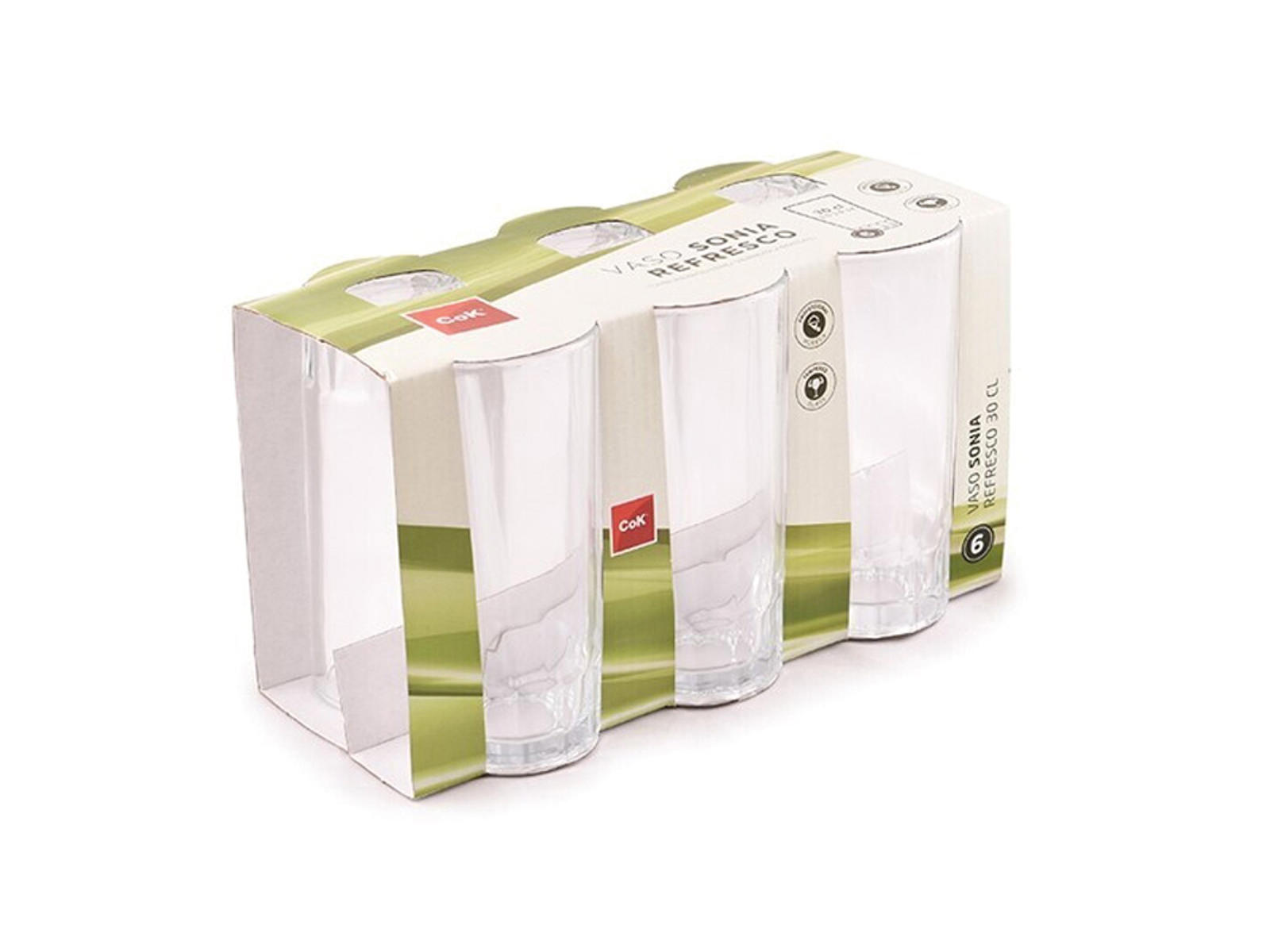 Los vasos Cegeco Sonia en tamaño de 30 cl vienen en un práctico paquete de 6 unidades. Tienen una forma clásica y atemporal con un diámetro de 69 mm y una altura de 142 mm. Están fabricados en vidrio duradero, apto para lavavajillas, lo que los hace ideales para el uso diario en cualquier hogar.