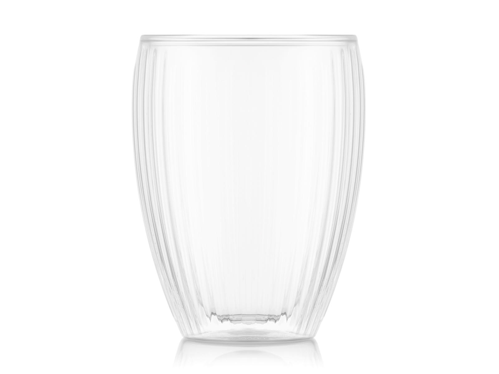 Este set de dos vasos de doble pared Pavina de Bodum tiene una capacidad de 32 cl y presenta un elegante diseño estriado. Los vasos están fabricados en vidrio borosilicato resistente al calor, con una válvula de silicona impermeable en la base que equilibra la presión del aire entre las dos capas de vidrio. Esto hace que los vasos sean ideales tanto para bebidas calientes como frías.