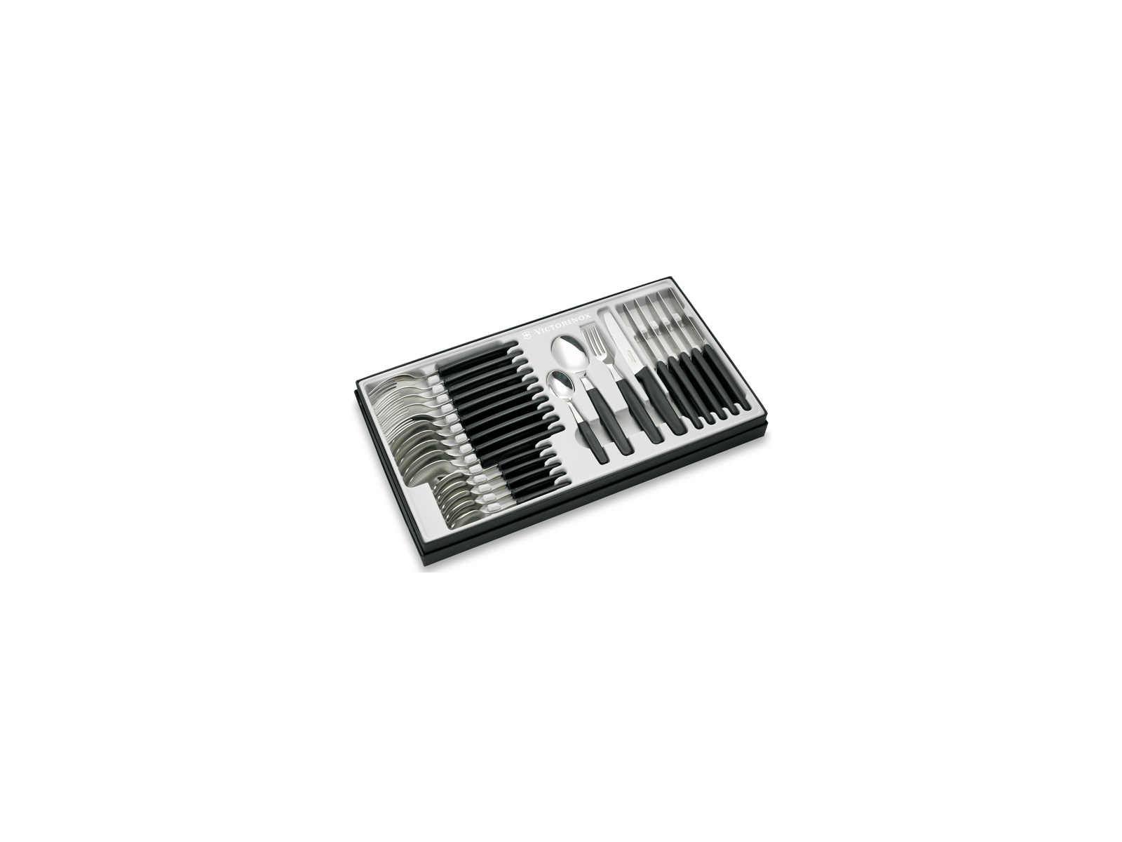Este set de cubiertos Victorinox Swiss Modern te ofrece 24 piezas funcionales con un diseño atemporal, fabricadas en acero inoxidable duradero con mangos de Fibrox negros. El set incluye todo lo necesario para seis personas y combina la precisión suiza con una estética moderna. Ideal tanto para las comidas diarias como para cuando tienes invitados.
