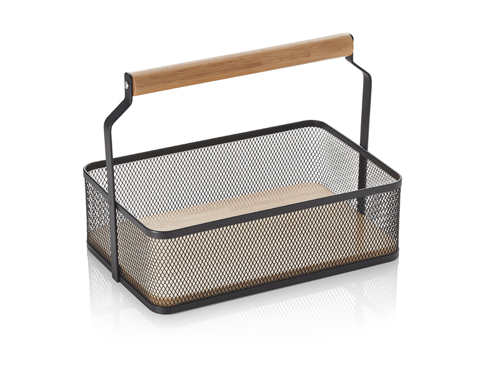 Esta elegante canasta de red de color negro con mango de madera combina funcionalidad práctica con un diseño estilizado. Con sus dimensiones compactas de 23,5x15,6x7,5 cm y una construcción robusta, es tanto duradera como decorativa. La canasta es ideal para almacenar pequeños objetos en el hogar, la tienda o la oficina.