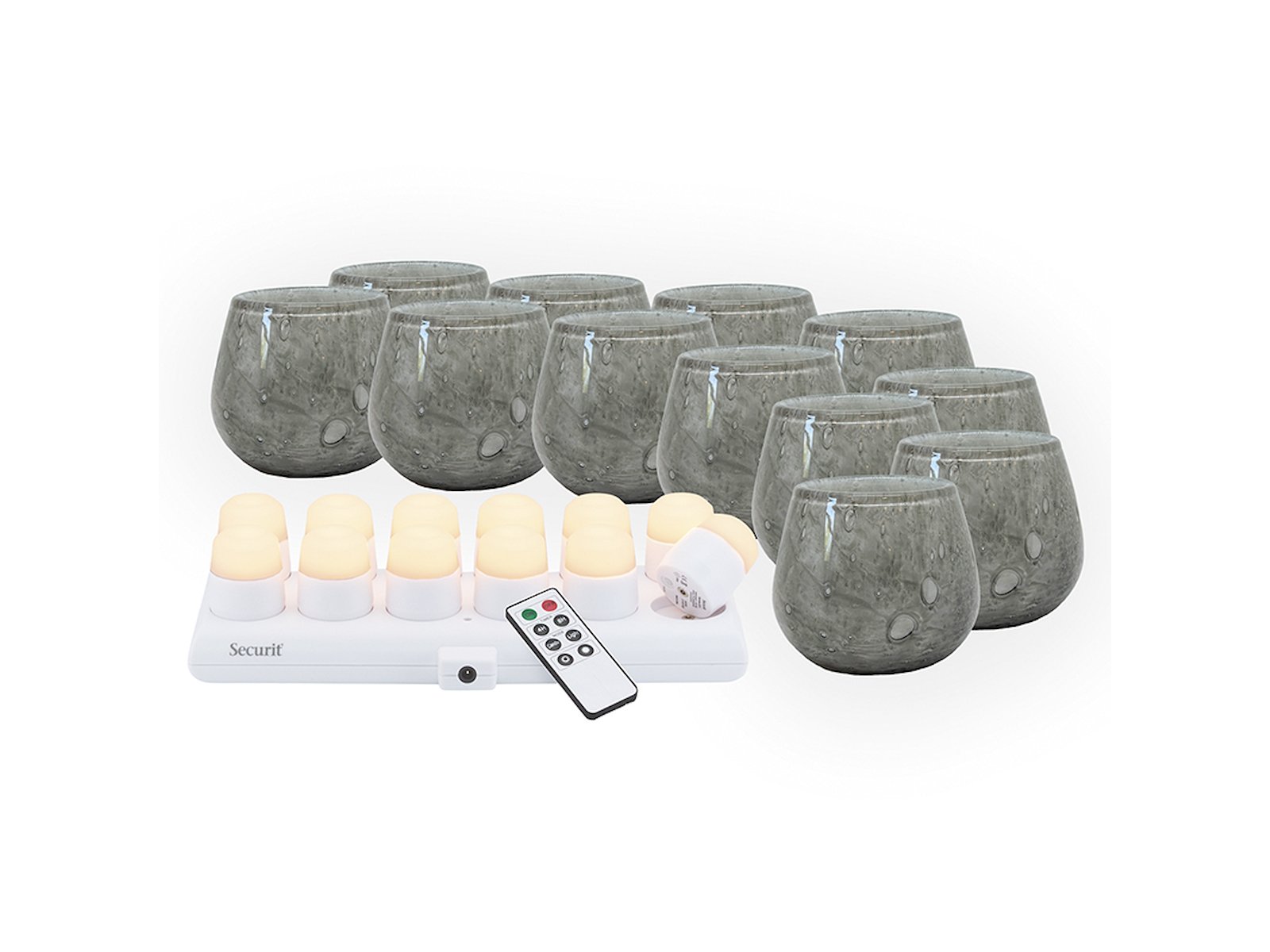 El juego de portavelas Luna de Securit combina un elegante diseño de vidrio soplado a mano con tecnología LED moderna. El set incluye 12 portavelas grises fabricados con vidrio reciclado, cada uno con un patrón único, además de 12 velas LED con efecto de llama realista. Este conjunto está fabricado en la UE y diseñado tanto para entornos profesionales como para uso doméstico.