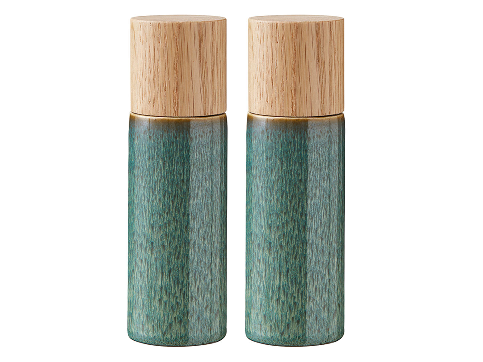 Este juego de molinillos de sal y pimienta de cerámica esmaltada de color negro con tapas de madera de roble combina funcionalidad con un diseño estilizado. El esmalte reactivo le da a cada juego una expresión única, mientras que la superficie mate negra aporta una elegancia sofisticada a tu mesa. Con una altura de 17 cm, los molinillos tienen un tamaño cómodo que se adapta bien a la mano.
