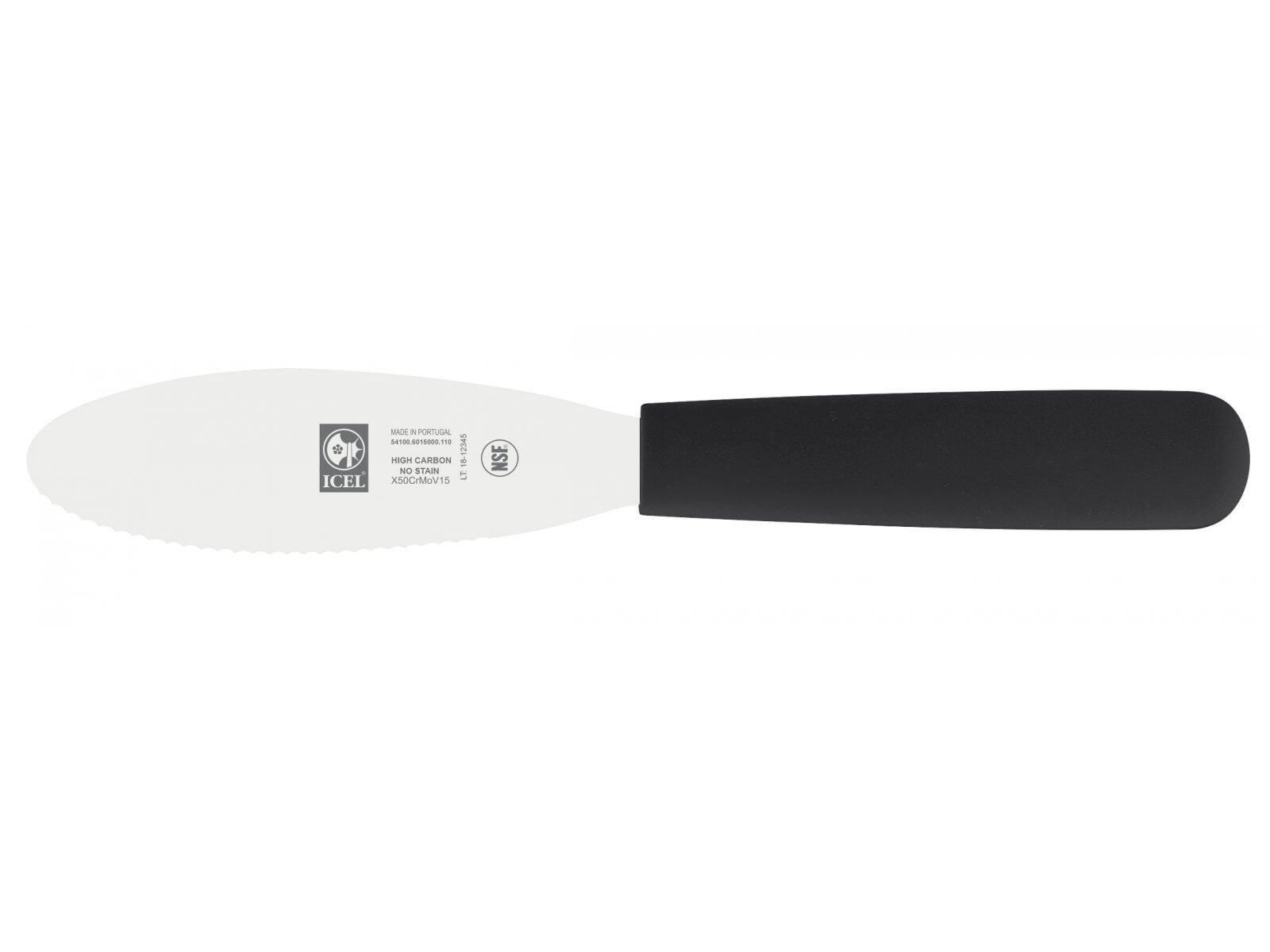 Este cuchillo de untar profesional de Icel con un filo ondulado de 11 cm combina funcionalidad con durabilidad. El mango negro proporciona un agarre seguro, mientras que la hoja de 110 mm de largo facilita la distribución uniforme de los untar. Ideal para la preparación de sándwiches tanto en cocinas profesionales como en hogares.