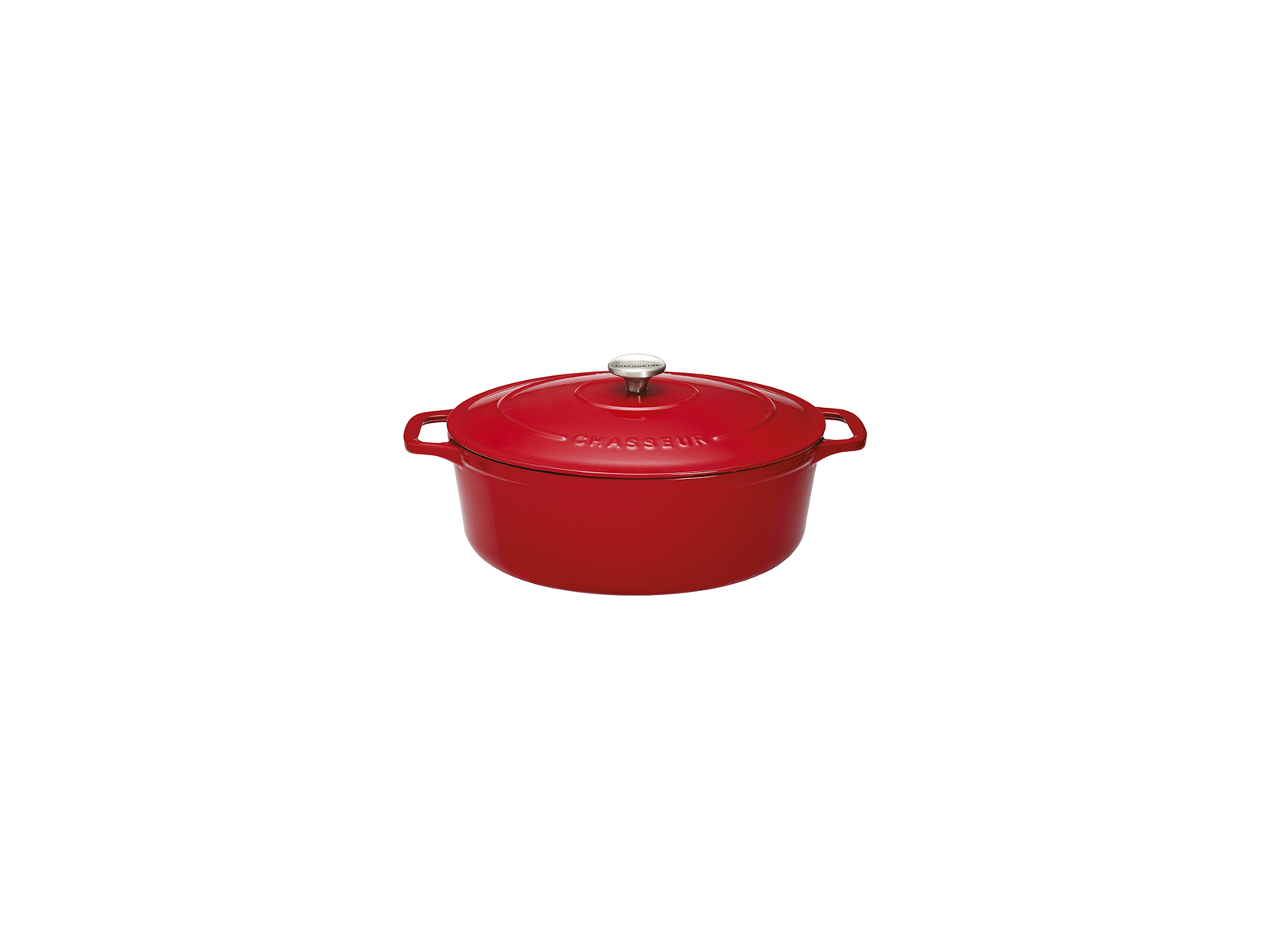 Los mangos ergonómicos proporcionan un agarre seguro, incluso cuando la olla está llena. El pomo del tapadera resistente al calor protege tus dedos al revisar la comida. La base esmaltada protege tus superficies de cocción y mesas de arañazos. La olla se puede utilizar en todo tipo de cocinas, lo que te brinda flexibilidad en la cocina sin importar tu fuente de calor. Con una altura de 170 mm y su forma ovalada, es especialmente adecuada para piezas de carne más grandes que requieren espacio en longitud.
