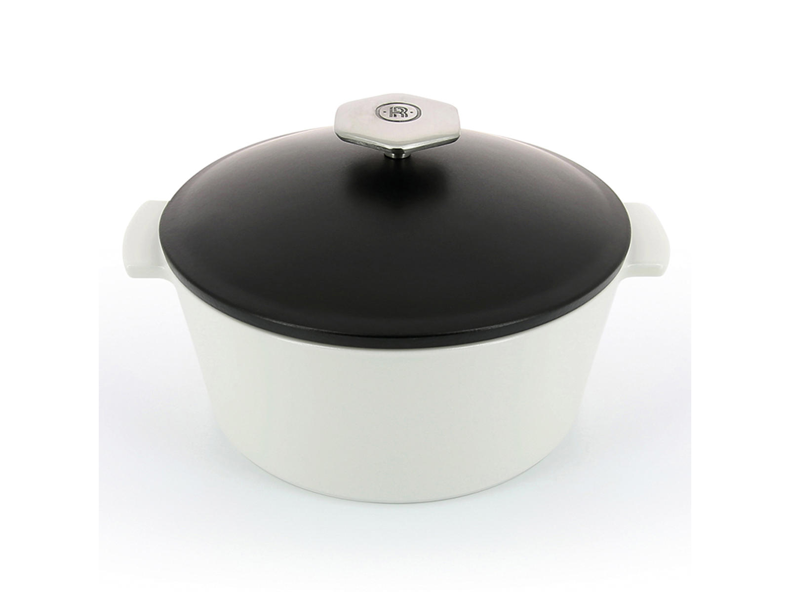 La cocotte mide 220 mm de diámetro y tiene una altura de 140 mm, lo que le otorga una capacidad de 2400 ml. Pesa 2,2 kg, lo que proporciona estabilidad durante la cocción. El acabado satinado blanco ofrece una estética atemporal que se adapta a cualquier cocina y puede pasar directamente de la estufa a la mesa como un elegante plato de servir.