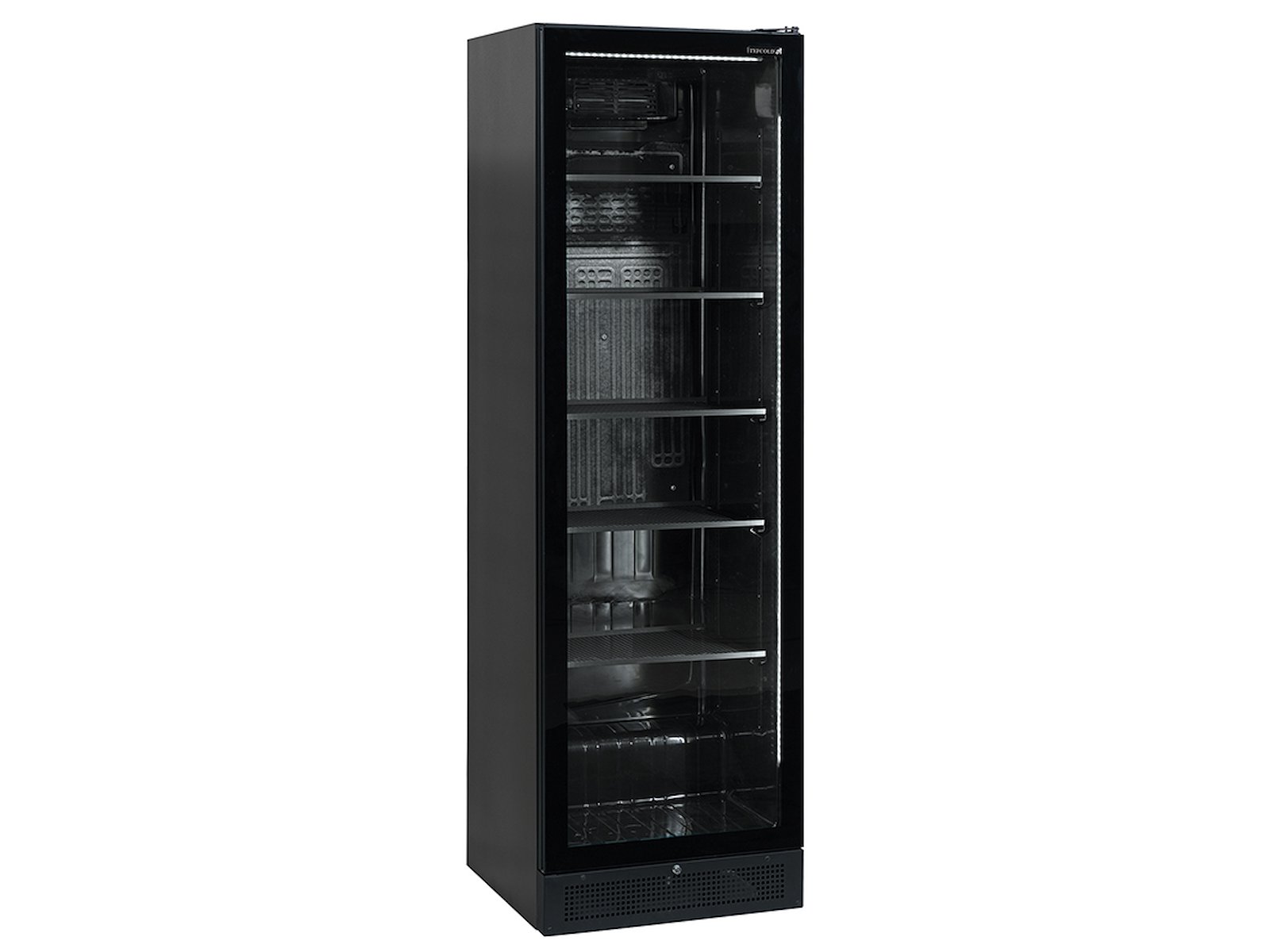 El Tefcold SCU1425H es un refrigerador exhibidor profesional de 347 litros con acabado negro tanto en su interior como exterior. La alta puerta de vidrio con marco de aluminio y la iluminación LED estratégicamente colocada crean una elegante solución de presentación que mantiene tus productos visibles y correctamente refrigerados.
