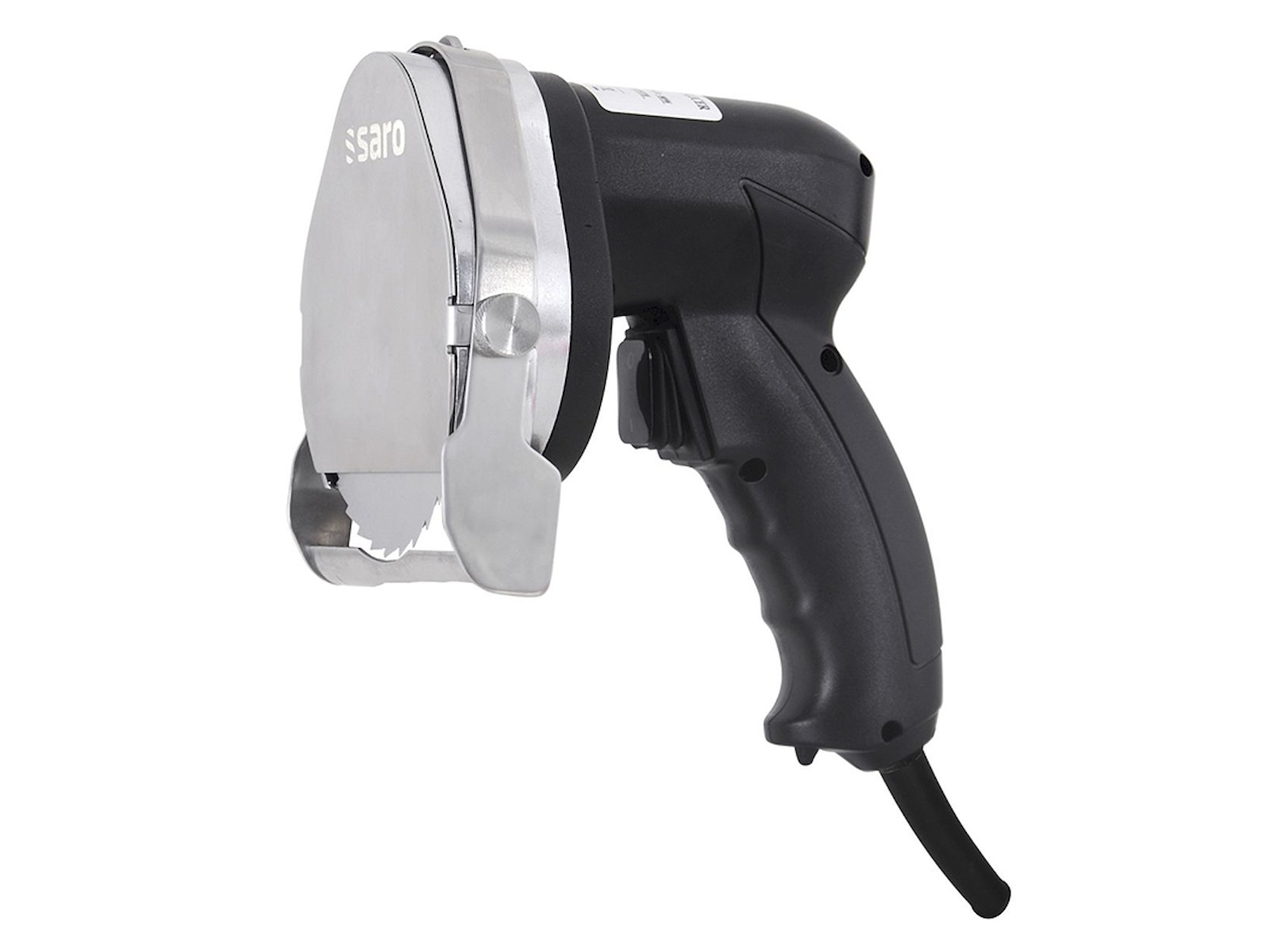 El cuchillo para kebab EL de Saro, con un grosor de corte ajustable de 0-8 mm y un diámetro de hoja de 100 mm, está diseñado para cocinas profesionales. Este cuchillo eléctrico combina precisión, eficiencia y fiabilidad en un diseño compacto que pesa 2 kg. Su color negro ofrece una apariencia profesional que se integra perfectamente en cualquier entorno de cocina.