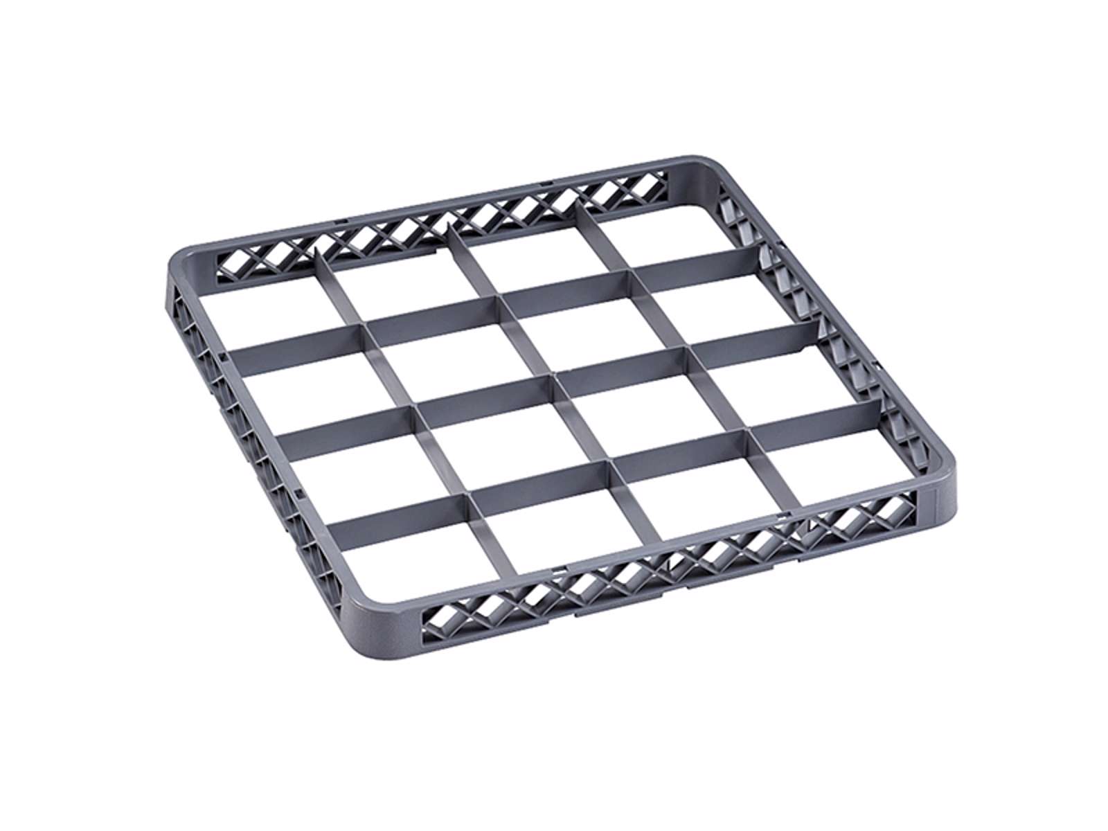 Fabricado en polipropileno gris resistente, que soporta altas temperaturas y uso repetido. Mide 500x500x45mm, lo que lo hace compatible con bandejas estándar en lavavajillas profesionales. Los 16 compartimentos separados están diseñados para acomodar diferentes tipos y tamaños de copas, manteniéndolas seguras y separadas durante todo el proceso de lavado.