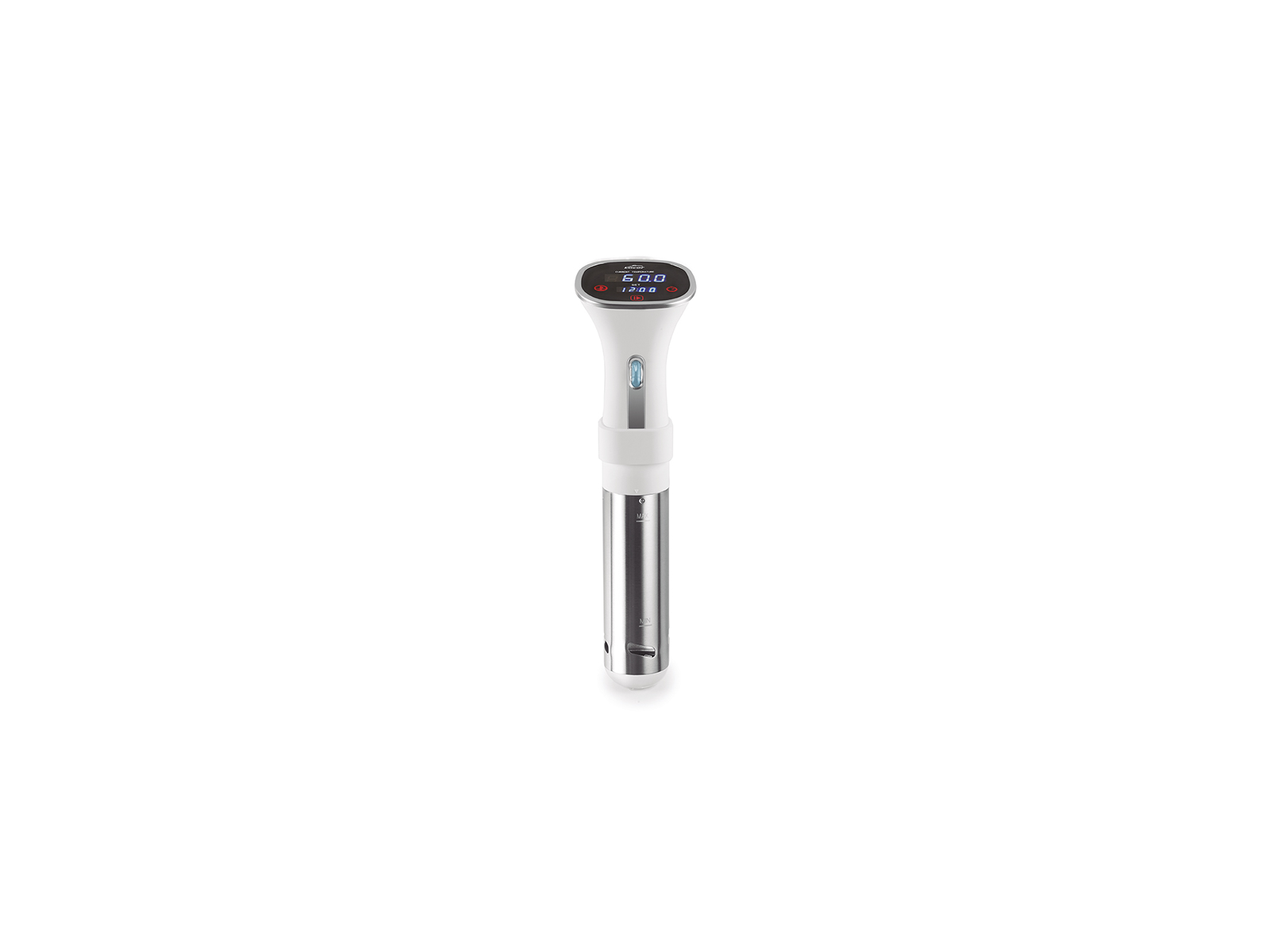 El circulador mide 370 mm de altura y 100 mm de diámetro, lo que lo hace compatible con la mayoría de cacerolas y recipientes. Circula 8,5 litros de agua por minuto, garantizando una distribución uniforme de la temperatura sin zonas frías. La temperatura se puede ajustar entre 20 y 90°C con una precisión de 1°C, y el temporizador integrado se puede programar hasta 99 horas para cocciones prolongadas. La unidad está fabricada en acero inoxidable de alta calidad para una máxima durabilidad.