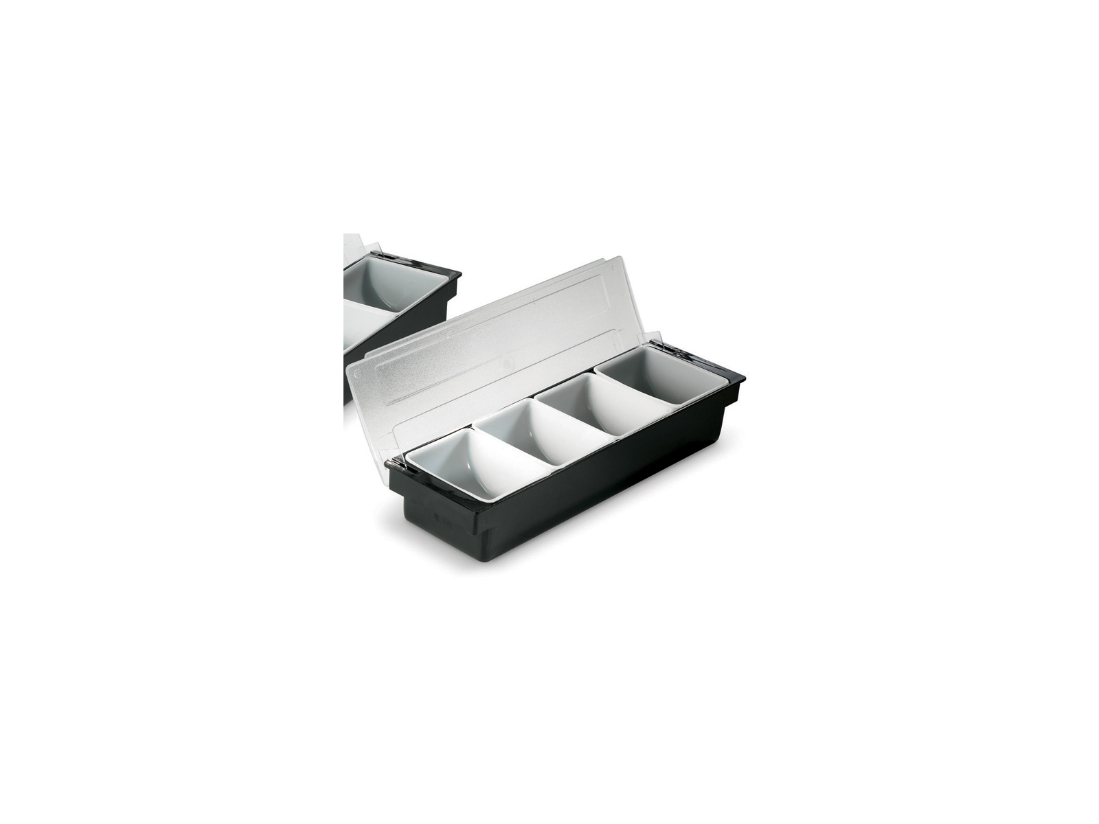 La división del contenedor en cuatro compartimentos separados lo hace especialmente adecuado para organizar contenido que debe mantenerse separado. Esto puede ser particularmente útil en la cocina para almacenar especias, ingredientes secos o utensilios. En entornos profesionales, se puede usar para mantener el control de pequeños componentes, artículos de oficina u otros elementos que requieren una organización sistemática. El color negro proporciona una apariencia neutra y profesional que se adapta a la mayoría de los entornos.