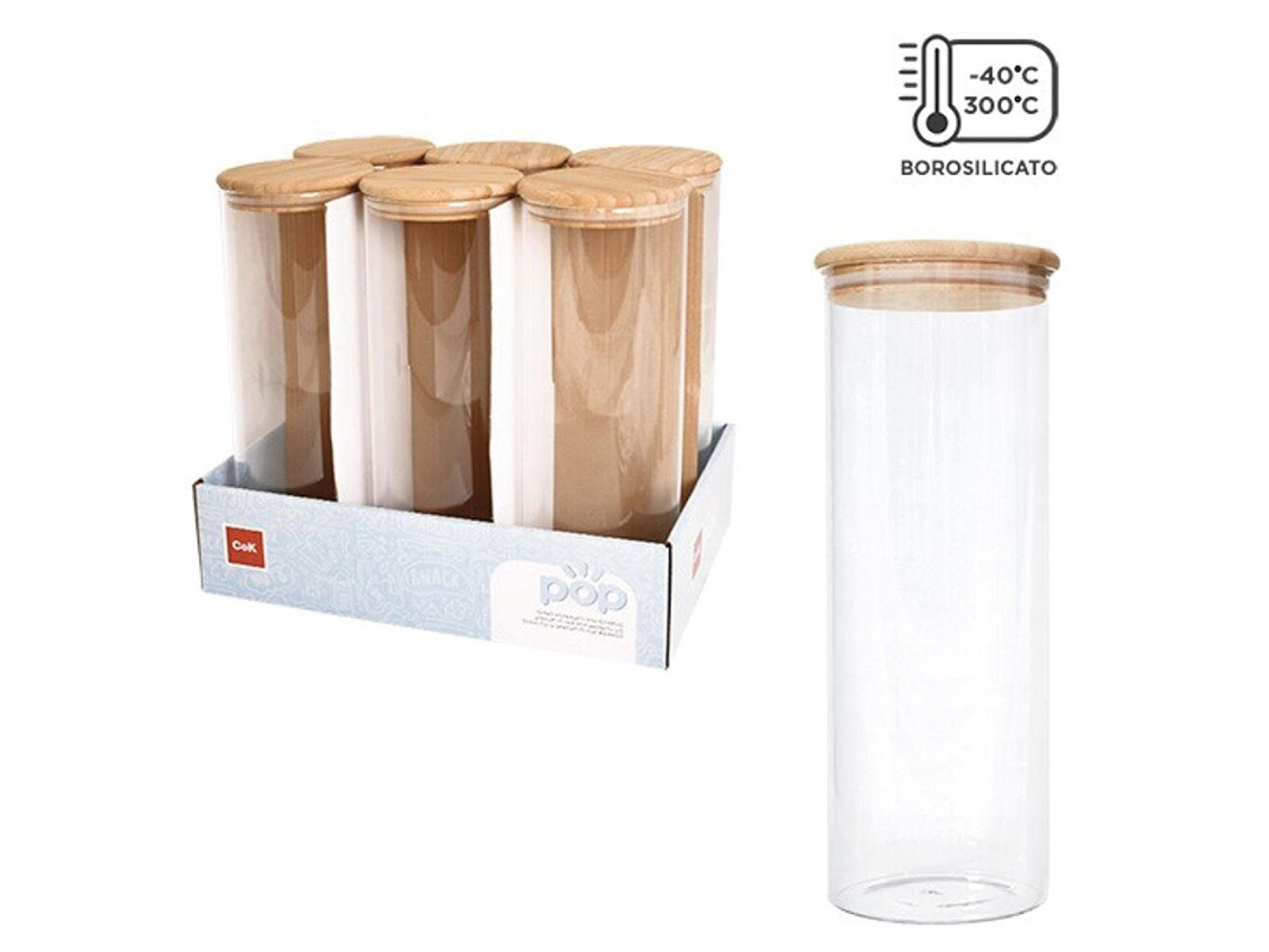 El tarro de almacenamiento tiene una capacidad de 1,9 litros y mide 235 mm de altura con un diámetro de 100 mm. Está fabricado de vidrio borosilicato transparente con una tapa de bambú natural y un borde de silicona ajustado. Producido por Cegeco, reconocido por sus productos de calidad para cocinas tanto privadas como profesionales.