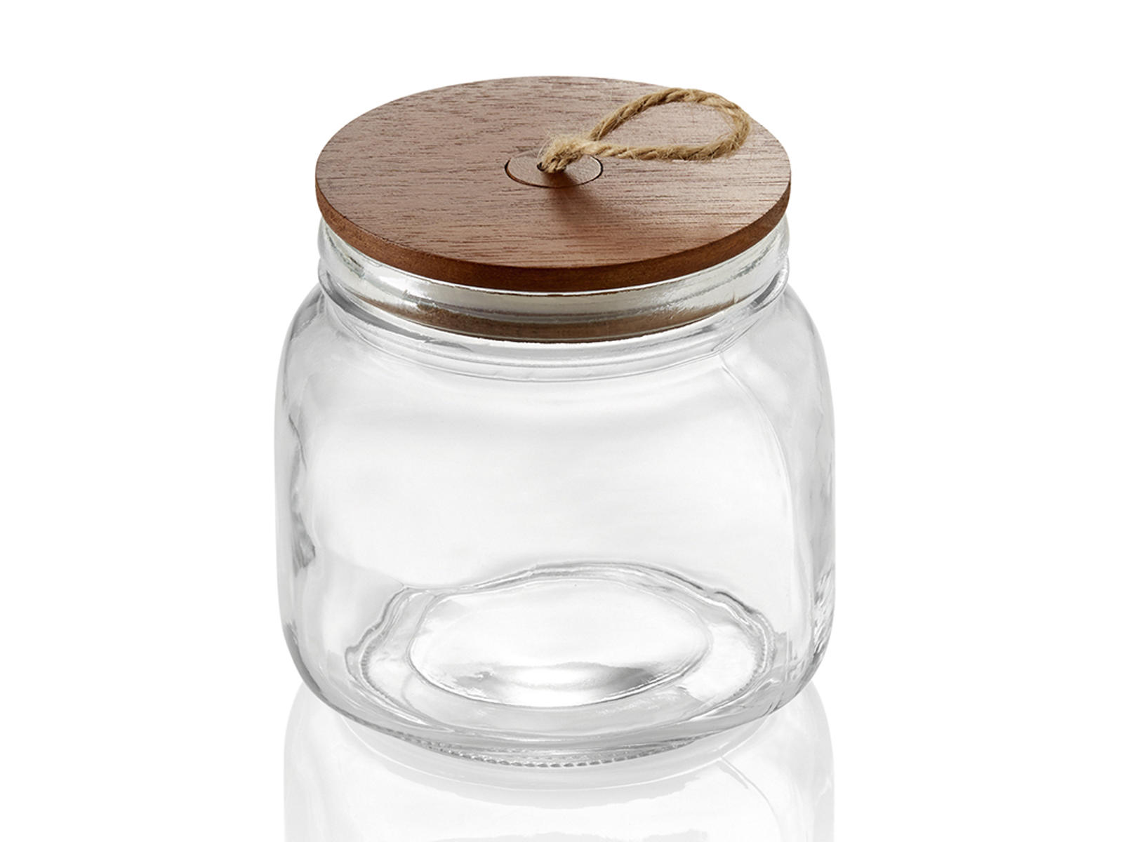 El frasco tiene una capacidad de 650 ml y mide 90 mm de diámetro y 120 mm de altura. Su peso total es de 530 gramos. El material es vidrio aprobado para alimentos con tapa de madera de acacia y sello de silicona. El diseño combina transparencia y materiales naturales para un estilo atemporal que funciona tanto como almacenamiento práctico como elemento decorativo en la cocina.