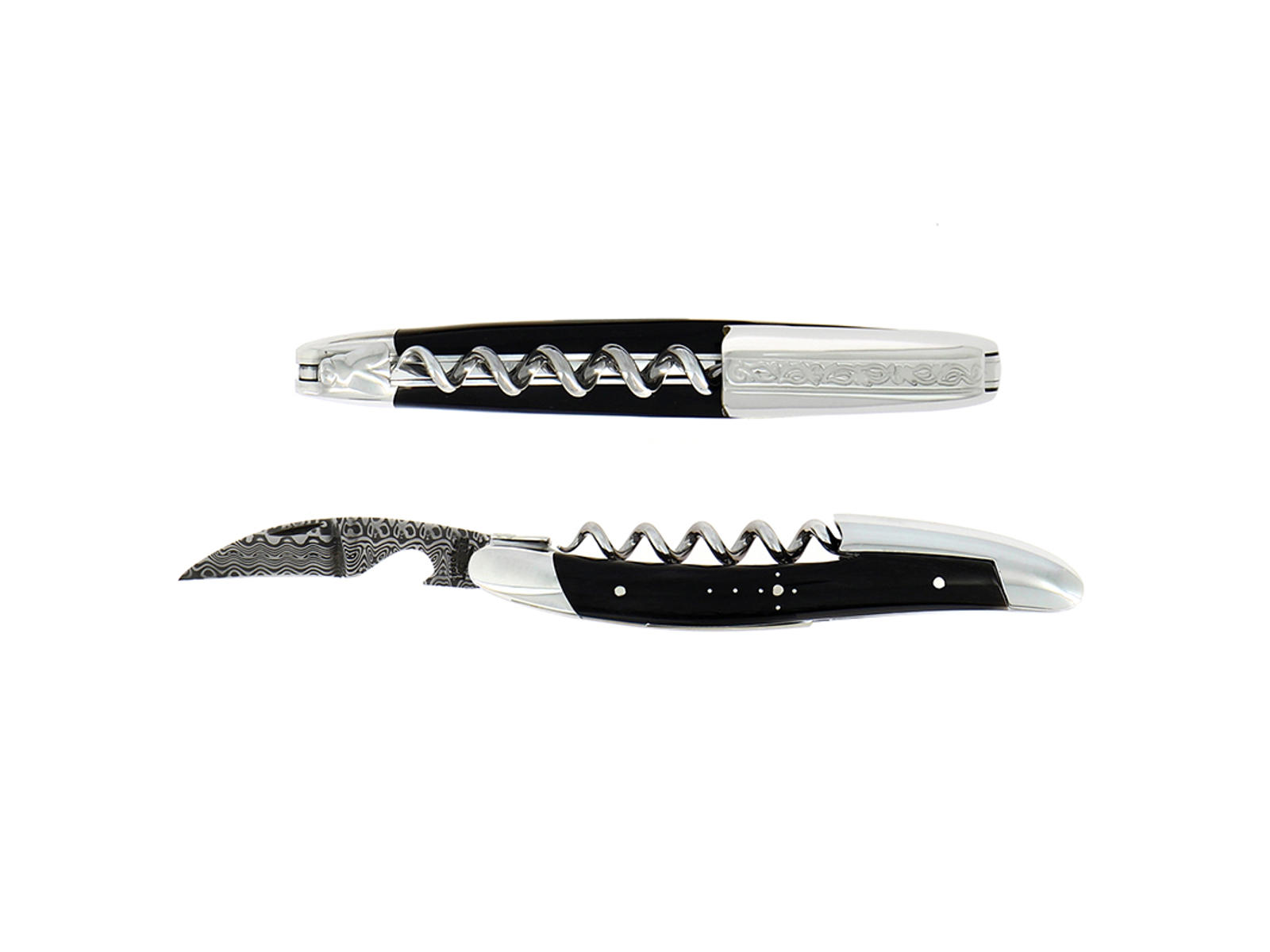 Este sacacorchos de Forge De Laguiole pesa solo 90 gramos y mide 120 mm en estado cerrado y 220 mm cuando está abierto. Está equipado con un pequeño cuchillo plegable para cortar la cápsula, un sacacorchos con mecanismo de palanca para una apertura eficaz y controlada, así como un abridor integrado. Los materiales incluyen acero inoxidable Damascus y exclusivo cuerno de búfalo negro, que brindan una apariencia única y un buen agarre.
