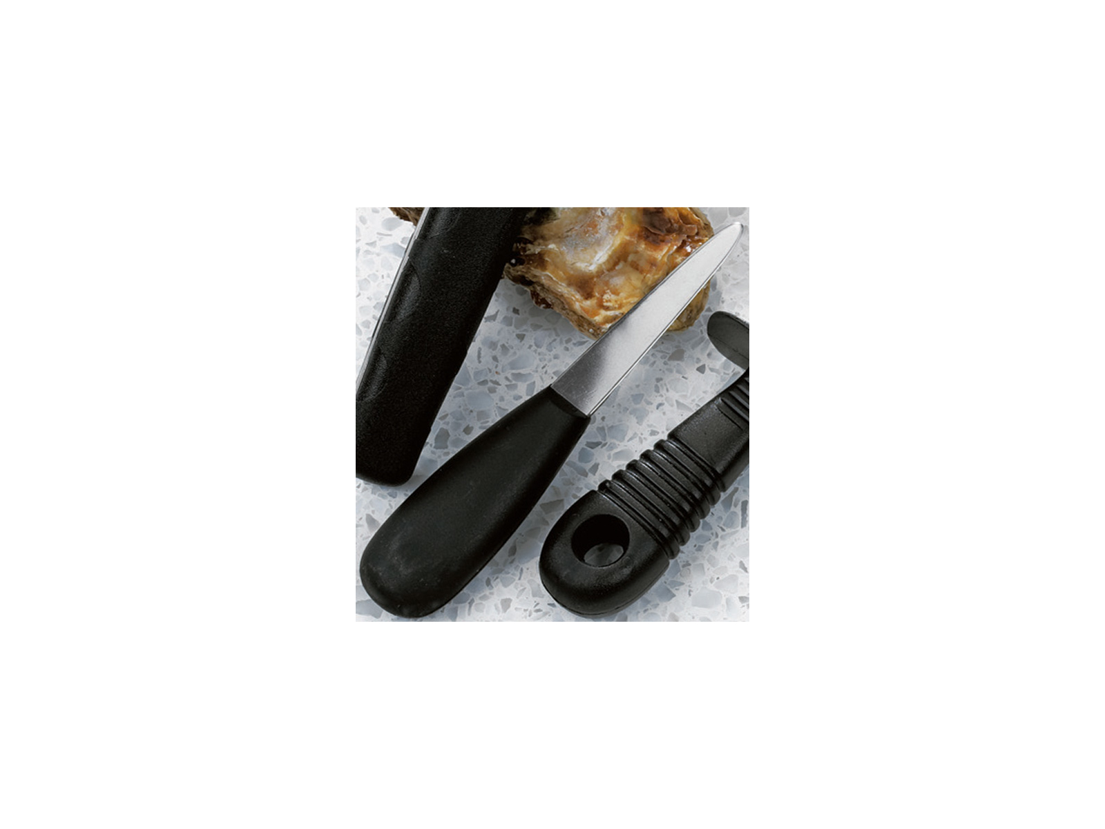 El mango de plástico negro está diseñado con un enfoque en la ergonomía, ofreciendo un agarre seguro incluso con manos húmedas. El peso total de 530 gramos está cuidadosamente equilibrado para proporcionar tanto fuerza como control durante el trabajo. Esto reduce la tensión en las muñecas y los dedos, incluso con un uso intensivo durante períodos prolongados, lo cual es crucial en cocinas profesionales donde se abren muchas ostras a diario.