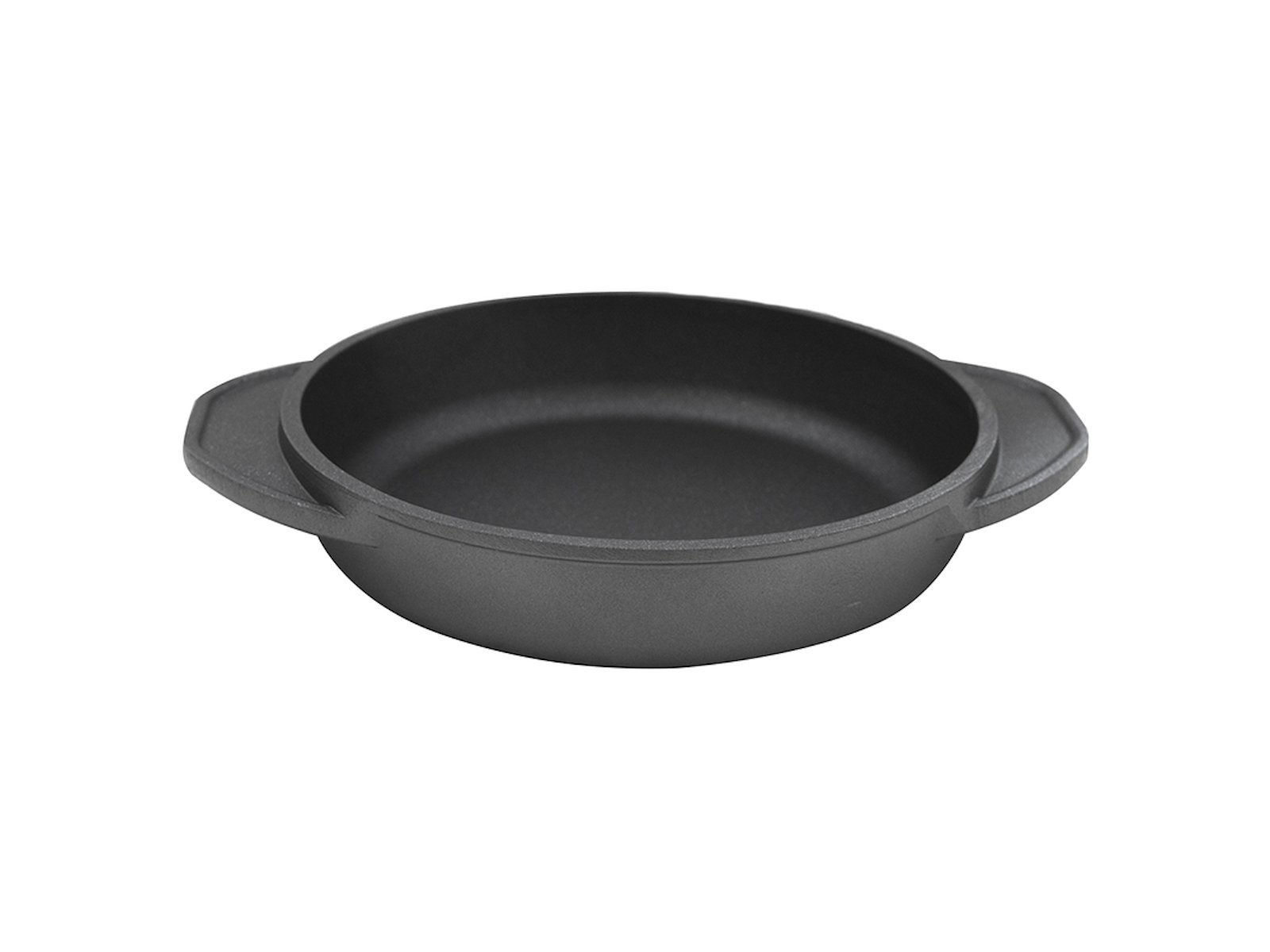 La bandeja Mibrasa SC28 está fabricada en aluminio fundido con un diámetro de 28 cm y un eficaz recubrimiento antiadherente. Su forma redonda garantiza una distribución uniforme del calor, mientras que la ligera construcción de aluminio facilita su manejo en entornos de cocina ocupados.