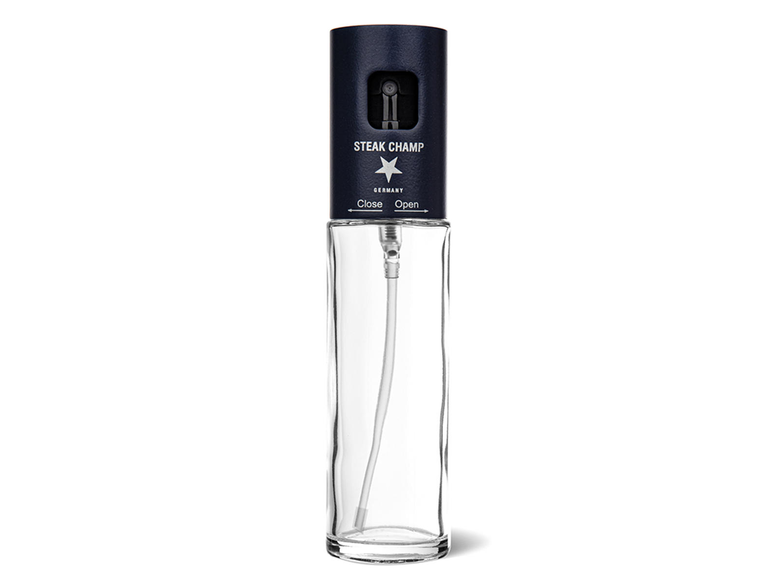 El spray de aceite de Steak Champ tiene una capacidad de 100 ml, suficiente para varias comidas. Está fabricado con materiales de calidad, con un recipiente de vidrio y detalles en acero inoxidable que aseguran una larga durabilidad. El spray pesa 220 gramos y es lo suficientemente compacto para caber en la mayoría de los armarios de cocina o estar a la vista en la encimera.