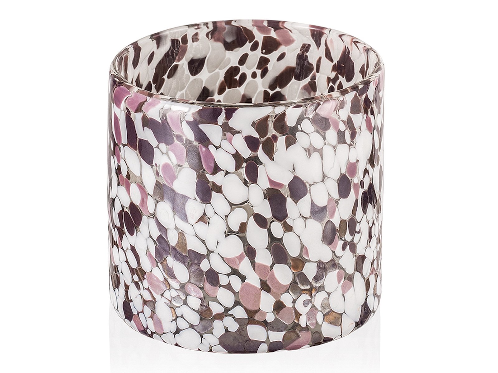 Este portavelas tiene un diámetro de 10 cm y una altura de 10 cm, lo que lo hace adecuado para velas estándar. Está fabricado con vidrio de calidad con un decorativo patrón de sprinkles en color berry. El tamaño del portavelas facilita su colocación en diferentes superficies, y su construcción estable asegura que permanezca firme.