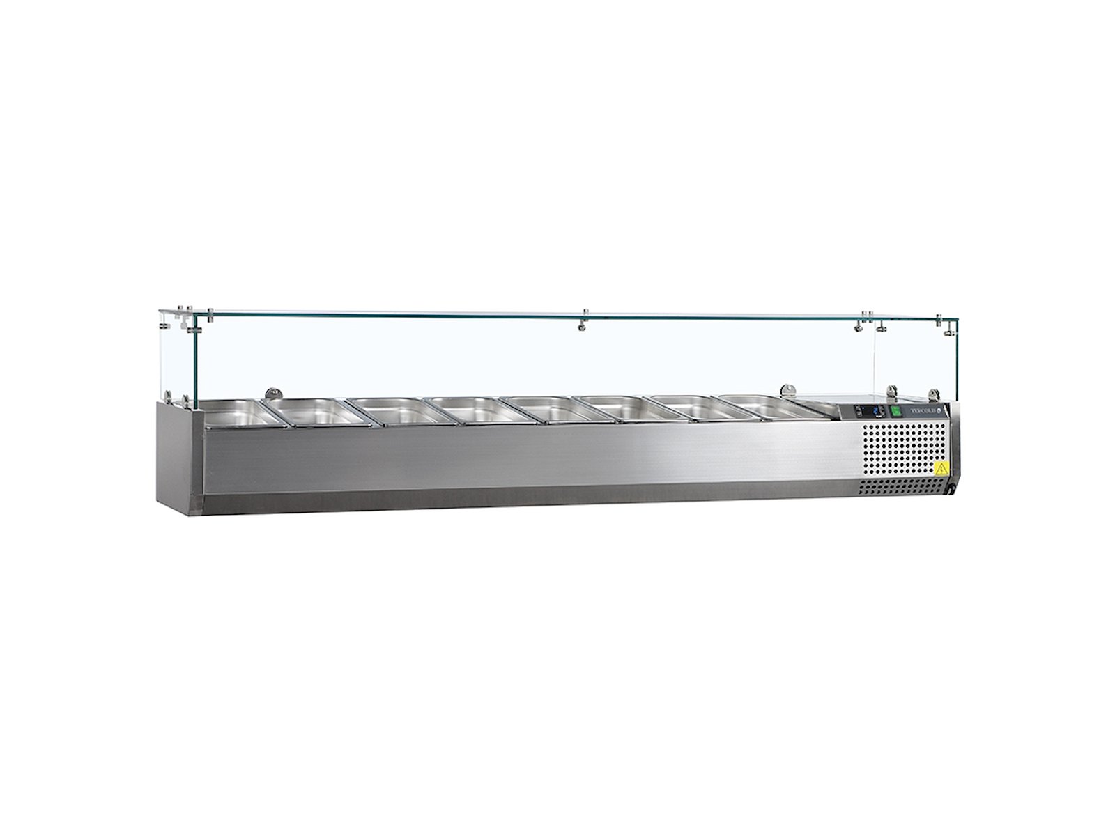 El Tefcold VK33-180 es un expositor refrigerado profesional de acero inoxidable con capacidad para 8 recipientes GN1/4. Mantiene tus ingredientes a una temperatura estable entre +2 y +10°C gracias a su eficiente refrigeración estática y a su preciso termostato electrónico. Está construido en acero inoxidable SS304, tanto en el interior como en el exterior.