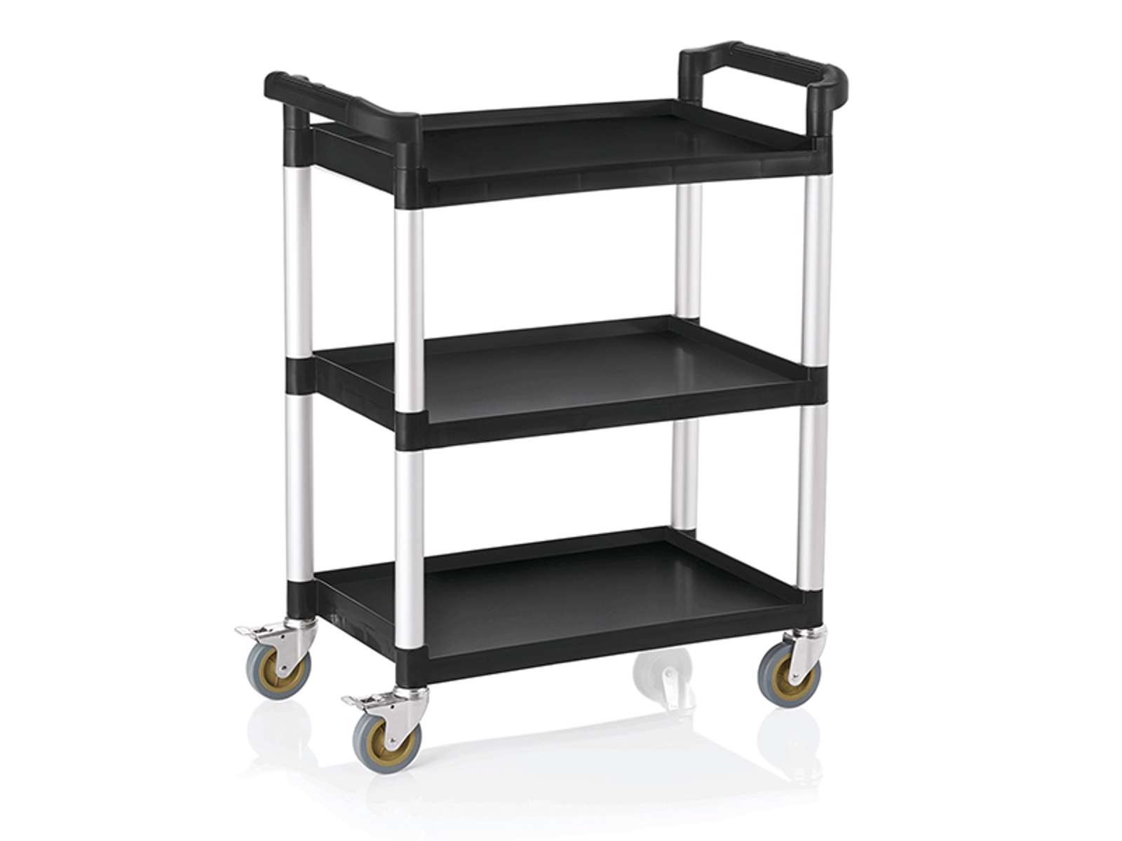 Este carro profesional de polipropileno negro y aluminio anodizado combina durabilidad con movilidad. Con tres estantes sólidos y una capacidad total de carga de 150 kg, está diseñado para el transporte eficiente de utensilios, alimentos y herramientas en entornos de cocina ocupados.