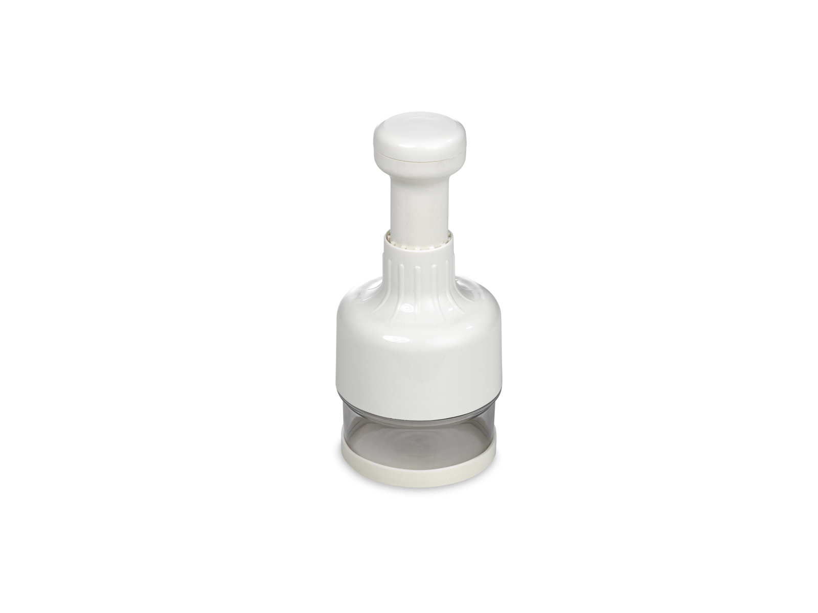 El picador de cebollas tiene un diámetro de 91 mm y una altura de 175 mm. Pesa 475 gramos, lo que le proporciona una buena estabilidad durante su uso sin ser demasiado pesado para manejar. La combinación de plástico y acero inoxidable asegura tanto durabilidad como un manejo higiénico de los alimentos.