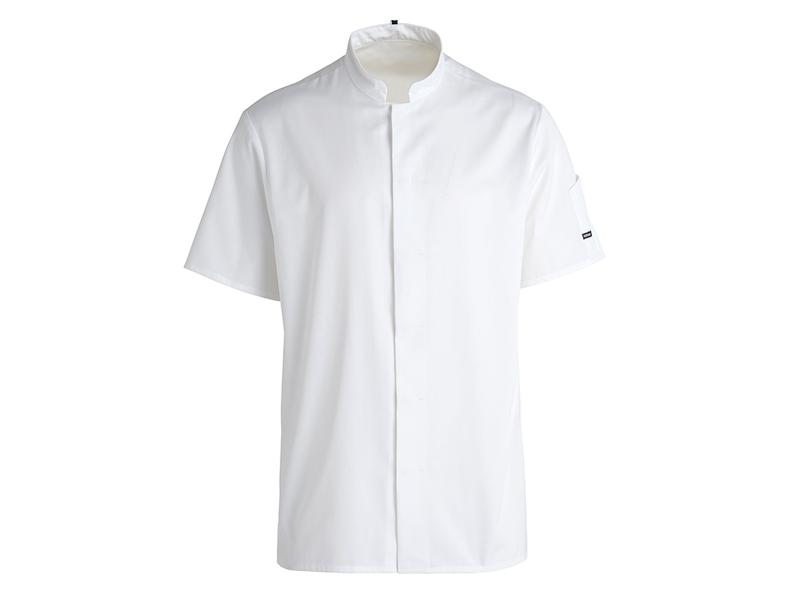 El material de la chaqueta de chef está desarrollado para ser lavado a altas temperaturas, lo que asegura una efectiva eliminación de manchas de comida y bacterias. Esto prolonga la vida útil de la chaqueta y mantiene un ambiente de trabajo higiénico. El modelo de manga corta es especialmente adecuado para cocinas donde la temperatura puede aumentar, o donde es necesario poder lavar los brazos con frecuencia. Además, el clásico color blanco facilita ver cuándo la chaqueta necesita ser lavada, lo que apoya el alto estándar de higiene requerido en cocinas profesionales.