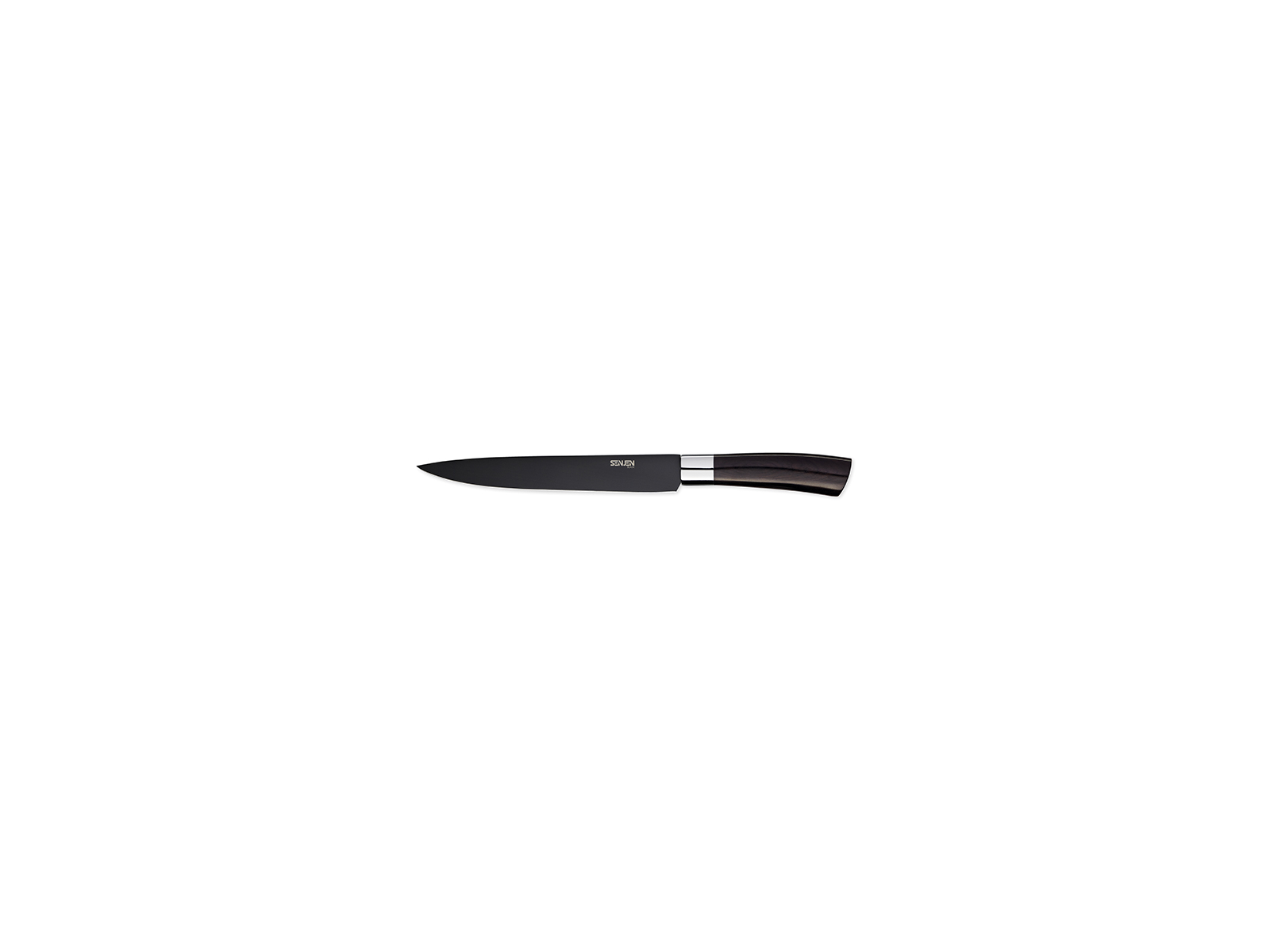 El cuchillo de despiece SENJEN Black combina funcionalidad con un elegante diseño danés. La hoja de 20 cm está fabricada en acero 7CR17MOV asiático con un recubrimiento de titanio negro, que evita que los alimentos pegajosos se adhieran a la hoja. El elegante mango de madera de sándalo negro garantiza un agarre cómodo, mientras que su peso ligero de solo 310 gramos proporciona un control óptimo.