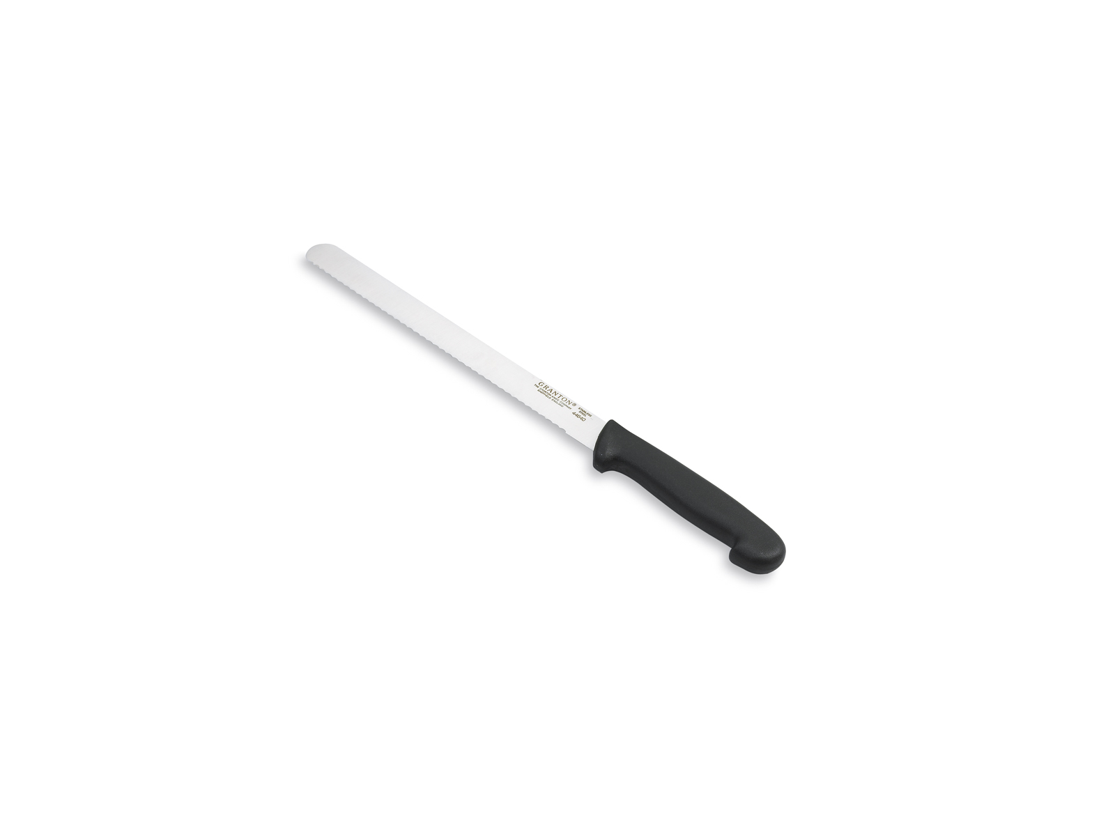 Este cuchillo de pan de 25 cm con afilado Granton está fabricado en acero inoxidable Sheffield, lo que garantiza un filo duradero. La hoja ondulada se desliza sin esfuerzo a través de pan recién horneado y productos con superficies duras o resistentes, sin aplastarlos. El mango de polipropileno negro proporciona un agarre seguro durante su uso.