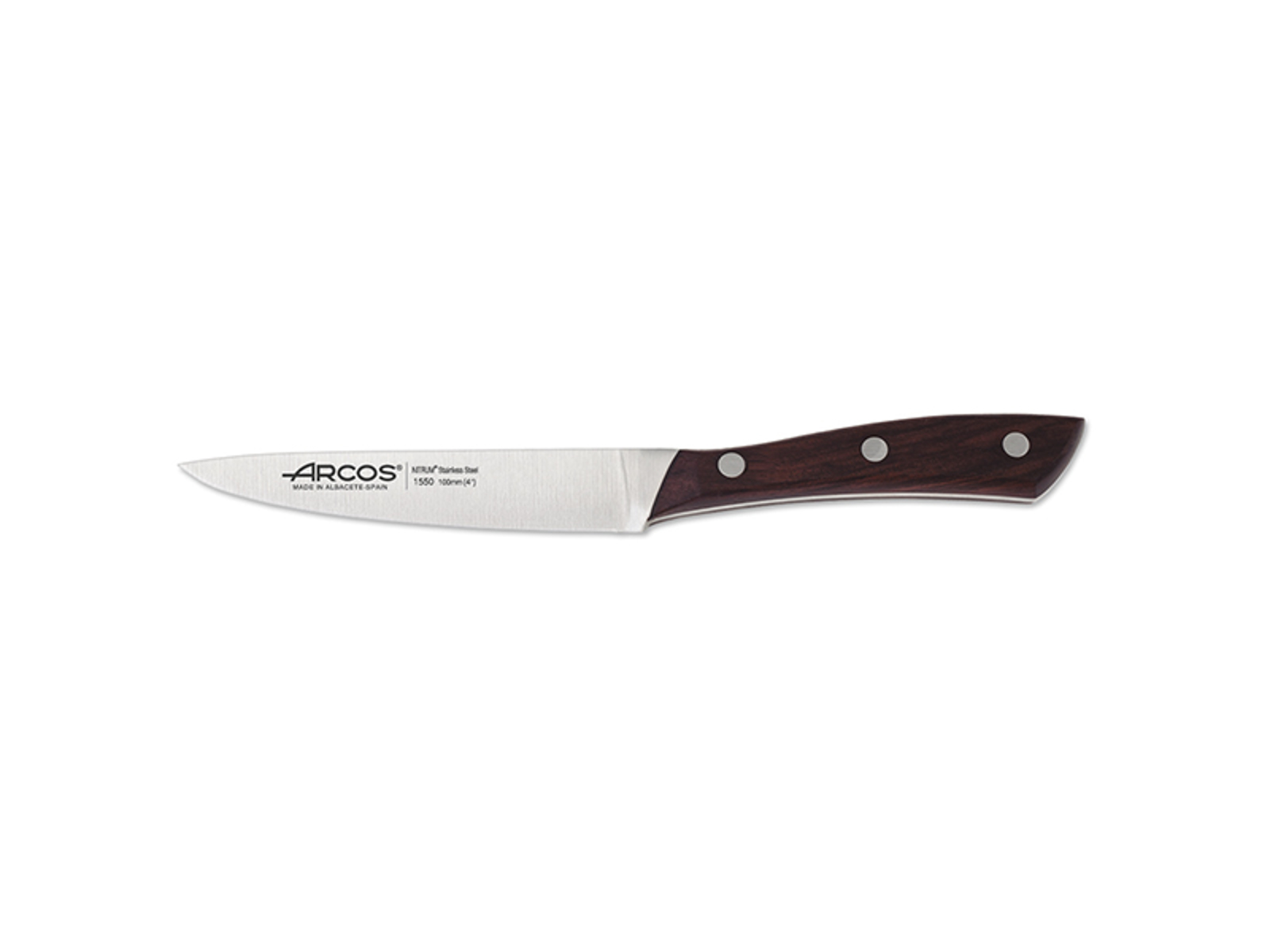La hoja en acero inoxidable NITRUM® es una aleación de acero patentada por Arcos, que otorga al cuchillo características excepcionales. Este acero especialmente desarrollado asegura que el cuchillo mantenga su filo durante más tiempo, resista mejor la corrosión y tenga una vida útil general más larga que los cuchillos estándar. El mango ergonómico de madera de rosa no solo es hermoso, sino que también proporciona un buen agarre que se adapta naturalmente a la mano. Remaches de acero inoxidable conectan la hoja y el mango para una máxima estabilidad.