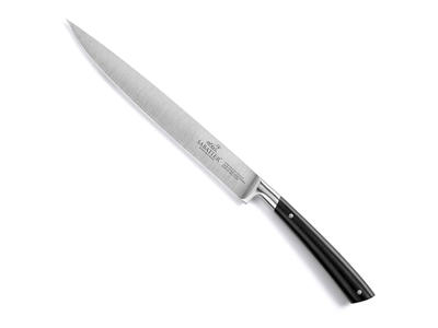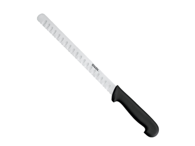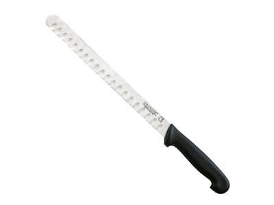 Del mismo modo, un cuchillo salmonero es imprescindible si desea servir salmón gravad o salmón ahumado en frío cortado en rodajas finas y elegantes. Especialmente un modelo con inserciones de aire, que Granton o SENJEN posee. El corte de aire hace que la cuchilla "suelte" más fácilmente el pescado.