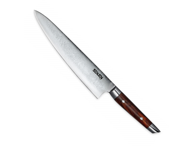 - Cuchillo del chef: El cuchillo del chef es el cuchillo más importante de la cocina gracias a su versatilidad. El cuchillo debe estar equipado con una hoja alta y potente, preferiblemente de más de 21 cm de largo. La longitud es crucial para poder cortar rebanadas finas y precisas. Si solo necesita un cuchillo del chef, entonces la opción más segura es un cuchillo del chef forjado, ya que el cuchillo debe ser lo suficientemente fuerte como para cortar, por ejemplo, un hueso de pollo.