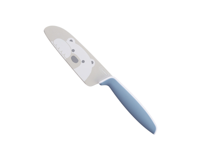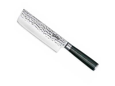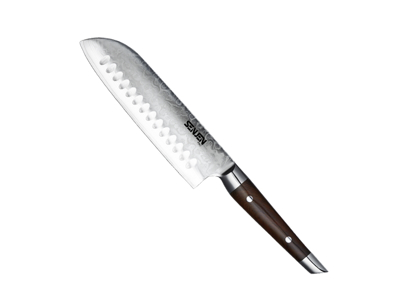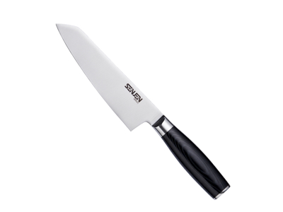 - Cuchillo Santoku: El cuchillo Santoku se ha vuelto extremadamente popular en los últimos años. Es conocido por su insuperable capacidad para cortar cebollas, puerros y lechugas porque la hoja ancha y ligeramente más corta la hace estable y precisa. Acostumbrarse a un santoku puede llevar algo de tiempo y práctica. Pero el paciente es recompensado; ya que el cuchillo es ligero y flexible, y tiene una forma que promueve naturalmente una buena ergonomía al cortar / picar en la cocina vegetal. El cuchillo Santoku tiene mucho en común con el cuchillo bunka (mencionado a continuación): la forma de la hoja lo hace extremadamente bueno para trabajos de precisión con verduras y frutas, pero también se puede utilizar para trozos más pequeños de carne y pescado.