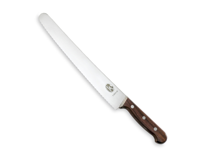 - Cuchillo panero/ Cuchillo universal: El último de los tres imprescindibles es un cuchillo con hoja ondulada, y preferiblemente con una hoja de 23 cm o más, por ejemplo, un cuchillo universal. Un cuchillo panero es, por supuesto, eminente para cortar pan, pero un cuchillo universal, que es más poderoso, tiene ondas más 'agresivas' que un cuchillo panero y tiene un balanceo en la hoja, también es realmente bueno para otras tareas, como picar chocolate, nueces y otros artículos de manera uniforme.