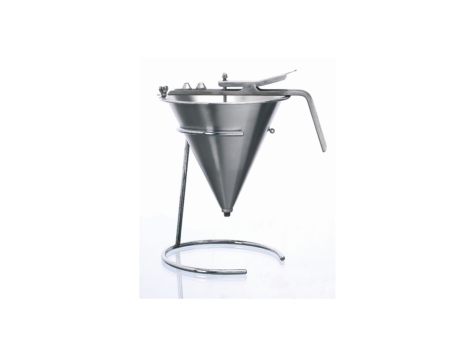 Las medidas precisas del embudo son Ø185x185 mm, lo que lo convierte en una herramienta práctica en la cocina. Tiene una capacidad de 1,9 litros y viene con dos acoplamientos intercambiables (Ø3 mm y Ø6 mm) además de una salida de Ø8 mm sin tubo. La construcción en acero inoxidable asegura buena higiene y larga vida útil. Recuerda que el soporte de alambre para montaje se vende por separado.