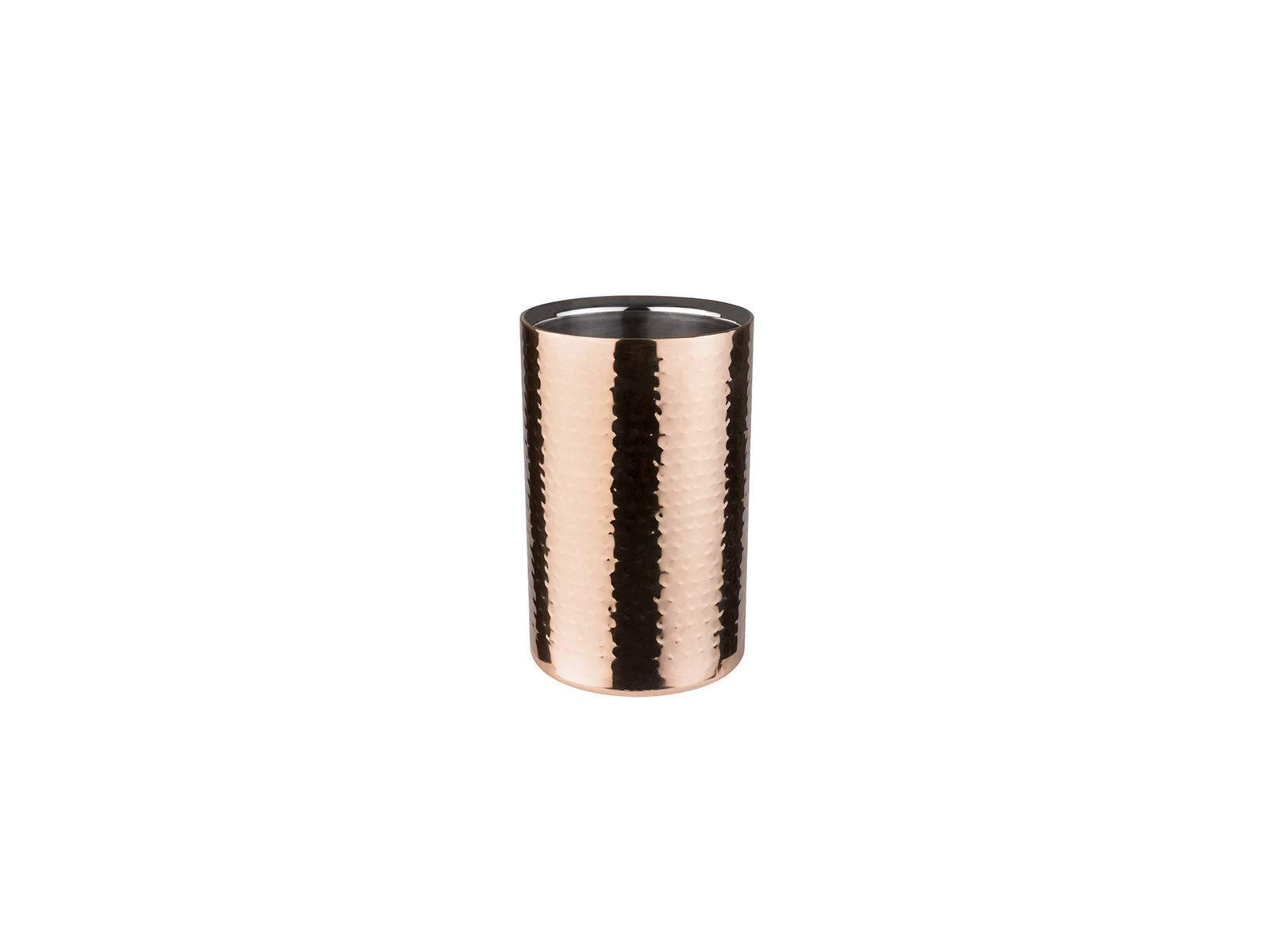 Este enfriador de vino de la serie APS Cooper está fabricado en acero inoxidable con un hermoso acabado en color cobre y una superficie martillada. La tecnología de doble aislamiento asegura que tus vinos mantengan la temperatura de servicio óptima por más tiempo. Con dimensiones de Ø12 cm y una altura de 20 cm, está diseñado para albergar botellas estándar de 0,7 a 1,5 litros.