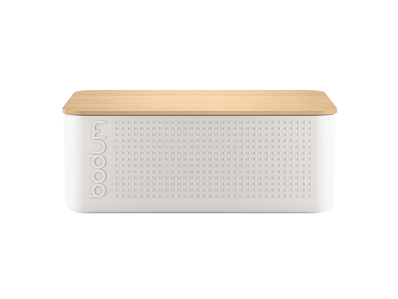 La caja de pan Bodum Bistro en blanco está diseñada para mantener tu pan fresco por más tiempo. Este espacioso recipiente de 36,5x23,7x13,8 cm está fabricado en plástico libre de BPA, mientras que la tapa de bambú incluida, con prácticas ranuras, actúa como tapa, tabla de cortar y bandeja de servicio.