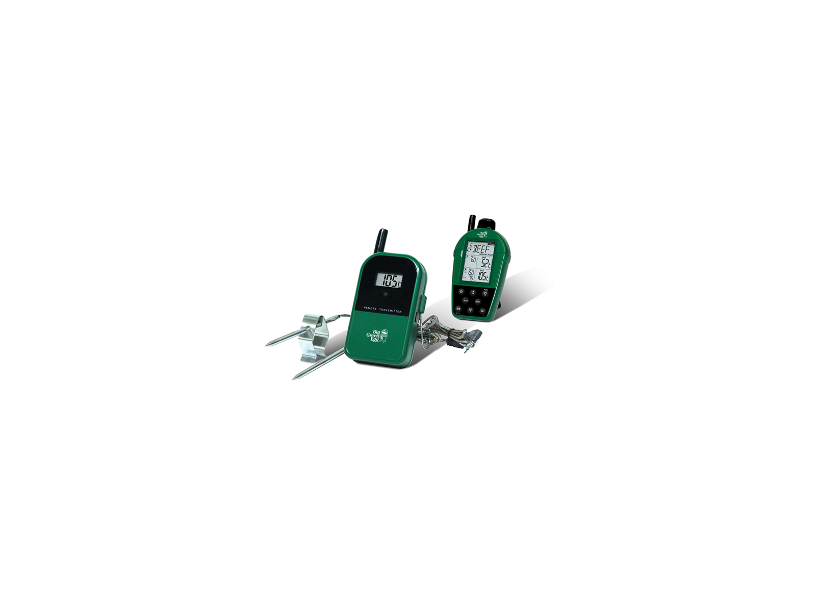 El termómetro viene en el característico color verde de Big Green Egg y está equipado con dos sondas independientes que muestran las mediciones de temperatura en tiempo real en el receptor incluido. La unidad está diseñada específicamente para su uso con parrillas Big Green Egg, pero también se puede utilizar con otros tipos de parrillas donde la medición precisa de temperatura es importante para el resultado.