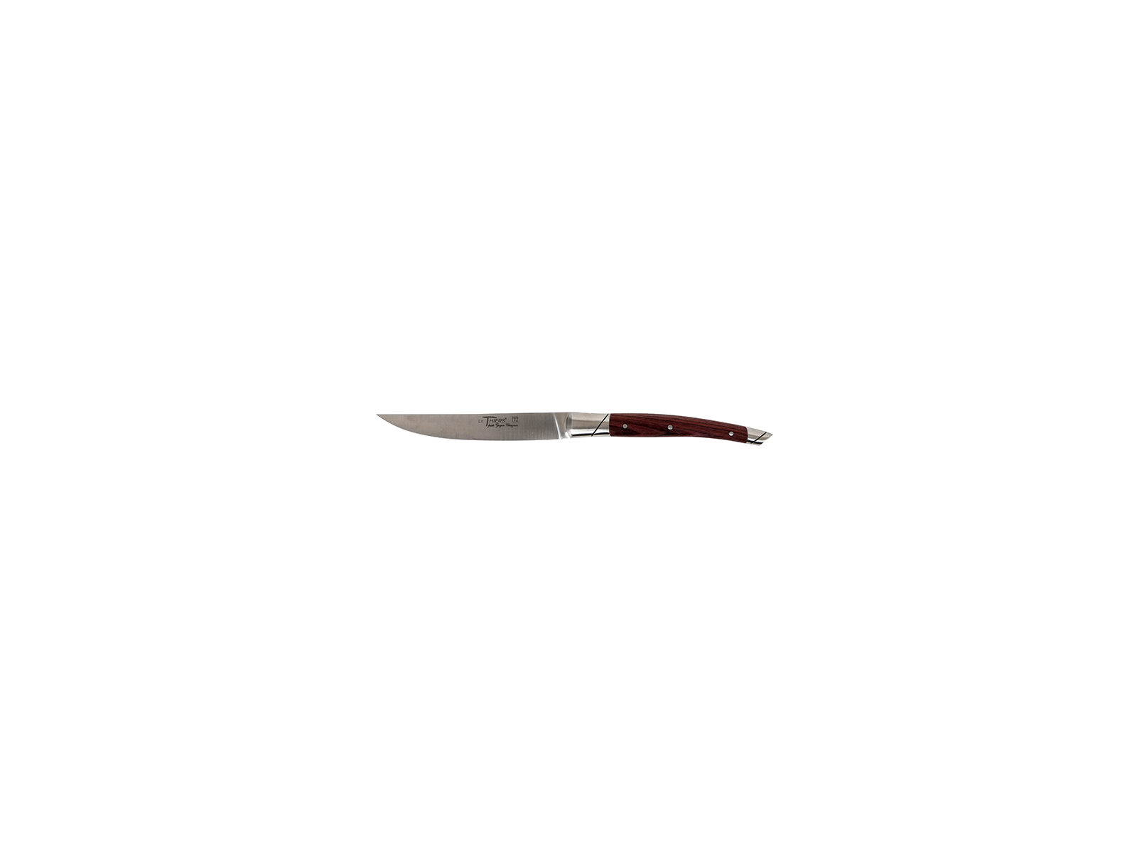 Con su forma estrecha, ligeramente curvada y elegante, el cuchillo se siente perfecto en la mano, haciendo que sea un placer cortar incluso los trozos de carne más resistentes. La alta calidad se puede ver y sentir, convirtiendo cada comida en una ocasión especial. El diseño del cuchillo es inconfundible y añade un toque de elegancia francesa a cualquier mesa.
