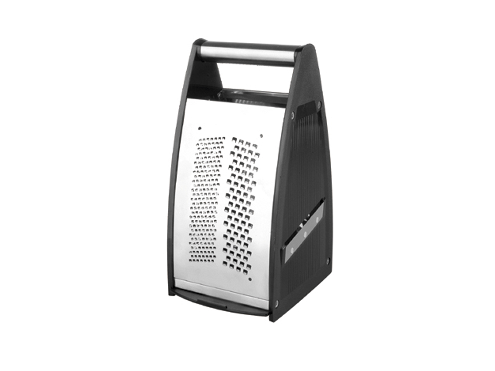 El rallador está fabricado en acero inoxidable de alta calidad, lo que lo hace resistente a la corrosión y al desgaste. El material sólido significa que las superficies de rallado permanecen afiladas incluso después de un uso repetido. El mango de plástico negro proporciona un agarre seguro, incluso con las manos húmedas, y reduce el riesgo de deslizamiento durante su uso. Su diseño cuidado facilita la limpieza del rallador; se recomienda el lavado a mano para preservar la calidad durante el mayor tiempo posible.