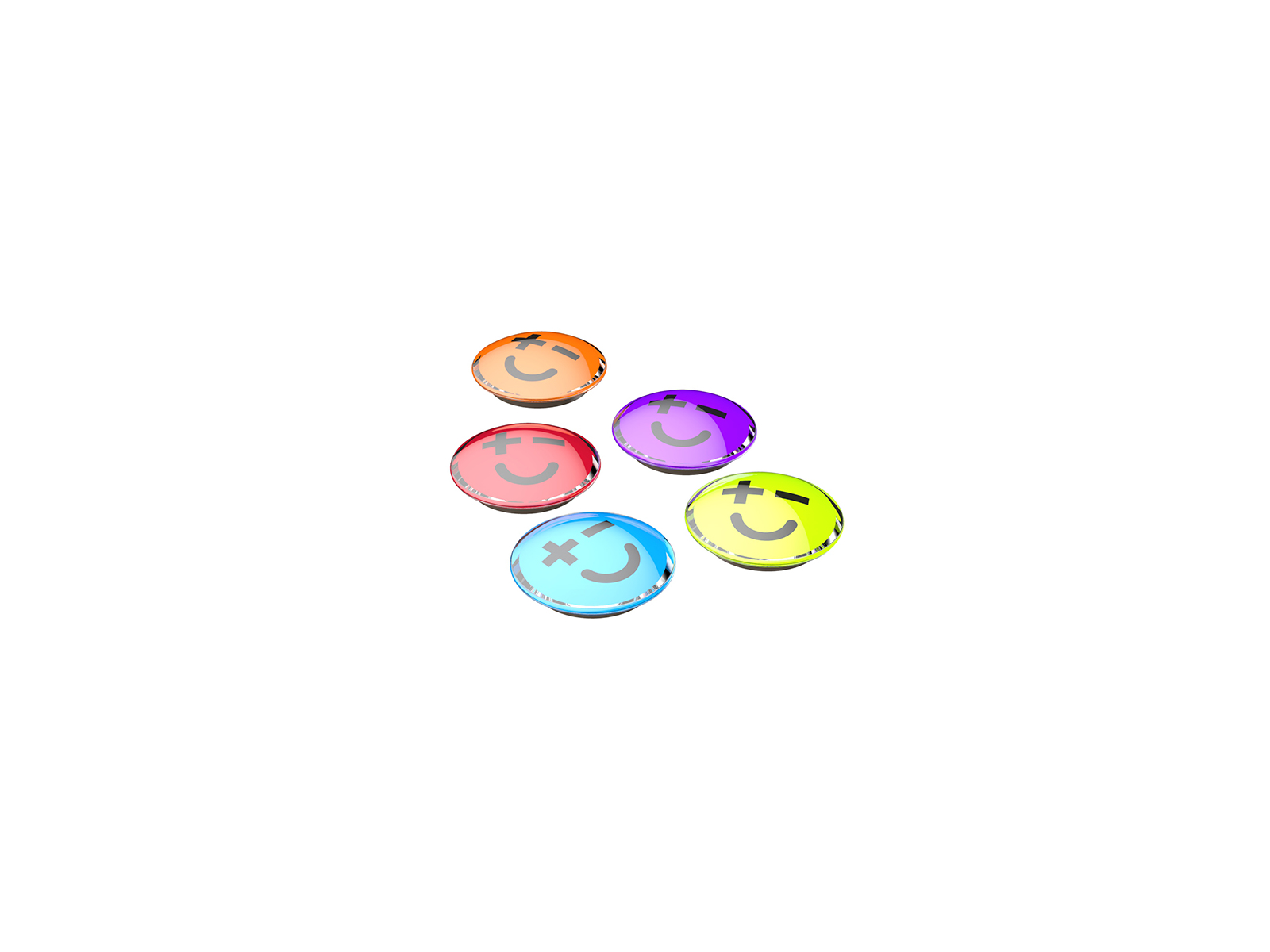 Cada paquete contiene 5 cristales magnéticos con caras sonrientes en colores rojo, naranja, verde, azul y morado. Los imanes tienen un diámetro de 30 mm, lo que proporciona un buen equilibrio entre visibilidad y tamaño práctico. Están fabricados con materiales duraderos que mantienen el color y la fuerza magnética con el tiempo.