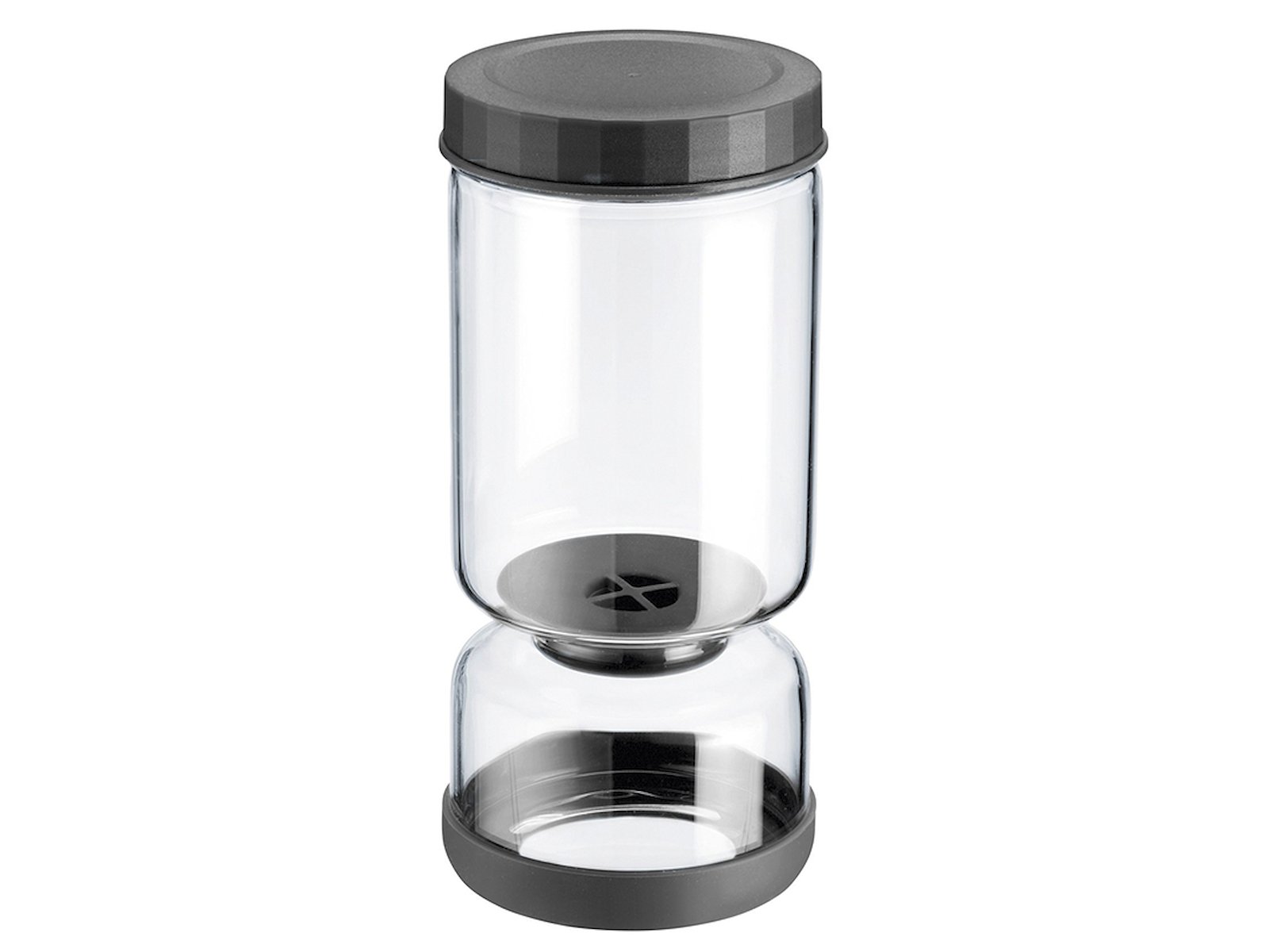 Con una altura de 240 mm y un diámetro de 105 mm, este tarro de almacenamiento se adapta perfectamente en la estantería del refrigerador. El recipiente de vidrio transparente proporciona una buena visibilidad del contenido, mientras que la tapa negra y el sistema de colador ofrecen una apariencia elegante. La capacidad total de 1300 ml hace que el tarro sea adecuado para porciones grandes o para almacenar durante varios días.