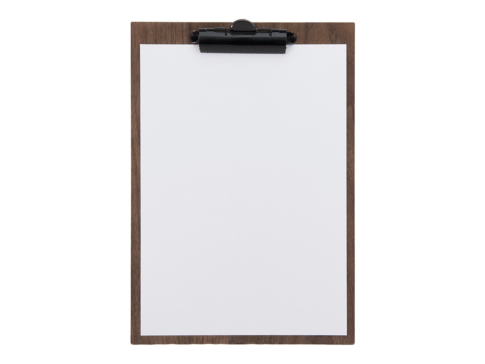 El portamenú mide 352 mm de altura, 185 mm de ancho y tiene una profundidad de 8 mm. Pesa 270 gramos, lo que proporciona una buena estabilidad en la mesa sin ser demasiado pesado para manejar. Fabricado en madera de nuez lacada con una pinza metálica negra para asegurar tus menús en formato A4.