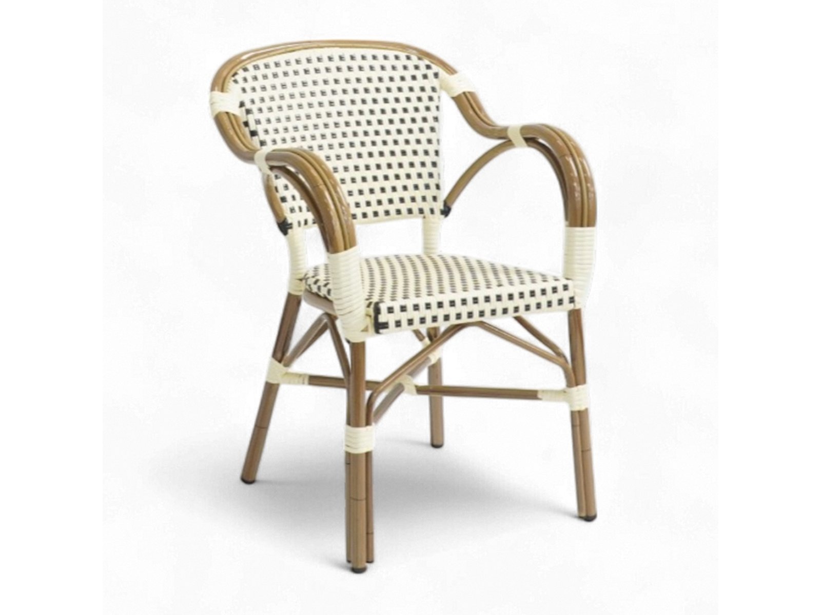 La silla de café Herning con reposabrazos combina una estética clásica con materiales modernos. La superficie trenzada de color marrón le confiere un aspecto acogedor, mientras que el ligero armazón de aluminio asegura durabilidad y manejabilidad. Con un peso de solo 4,9 kg, es práctica de mover, al mismo tiempo que ofrece una buena comodidad de asiento gracias a los reposabrazos integrados y el respaldo ligeramente curvado.